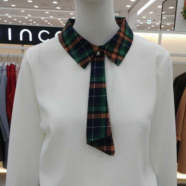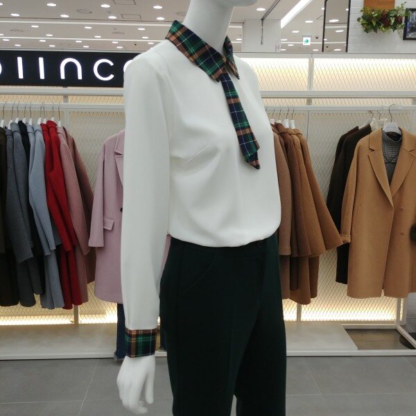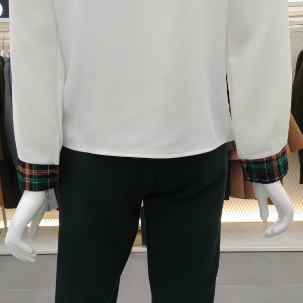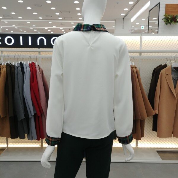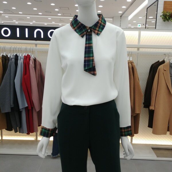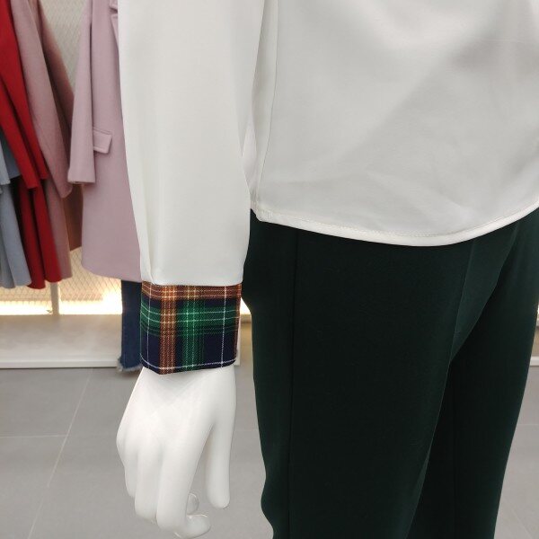 카라와 소매부분에 체크패턴이 돋보이는 블라우스입니다.여유있는 프리사이즈라 66 사이즈분도 편하게 입을수 있어요.총장 60.(오차있음)