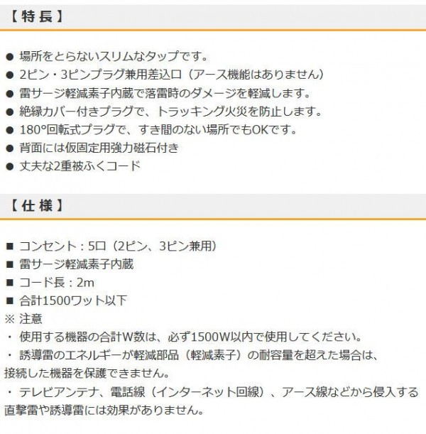 雷サージ軽減素子内蔵の場所をとらないスリムなタップ。