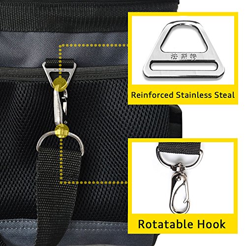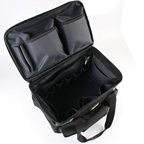 Functional- large capacity -- can put hardware tools, garden tools, maintenance tools, electric tools, telecommunication tools, fishing tools and so on. Shoulder strap is adjustable.