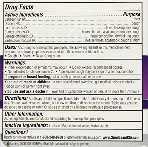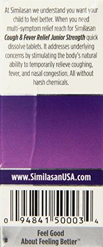 ReleaseDate : 2015-01-20 Studio : Similasan Publisher : Similasan Binding : Health and Beauty Product Description New 100 percent natural active ingredients. Ages 6 - 11. Helps relieve: mucus, cough, fever, chest and head congestion. Feel good about feeling better. At similasan we understand you want your child to feel better. When you need maulti-symptom relief reach for similasan cold and mucus relief junior strength quick dissolve tablets. It addresses underlying concerns by helping stimulate the body's natural ability to temporarily relieve mucus, coughing, fever, and chest and head congestion. All without harsh chemicals. Our original Swiss formulas are made with 100 percent natural active ingredients, and for over 30 years have been providing families with remedies they can trust. Based on a 2013 similasan quantitative study of 202 primary care physicians and physicians who were open to homeopathic treatments (82 percent selection rate). Made in Switzerland. According to homeopathic principles, the active ingredients in this medication help temporarily relieve symptoms associated with the common cold, such as: mucus, cough, fever, chest and head congestion. 0
