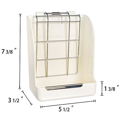 Dimensions: 5 1/2inch length, 3 1/2inch width, 7 3/8inch high. The hay feeder have back lock and its diameter approx 5/8in, please pay attention to the measurement picture and check your cage size whether it fits or not.