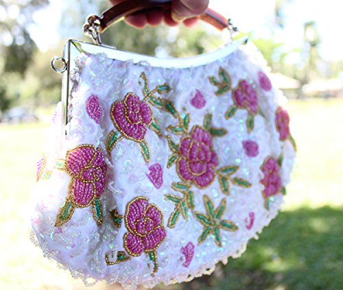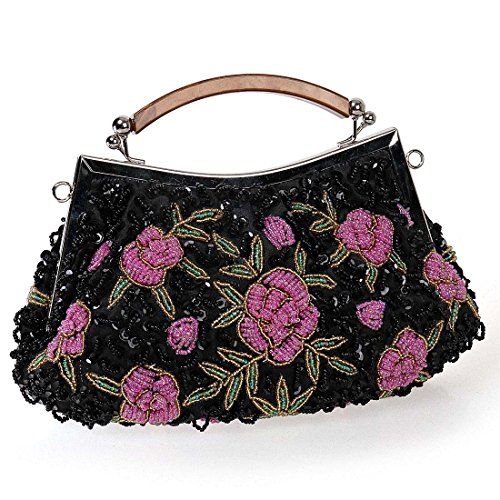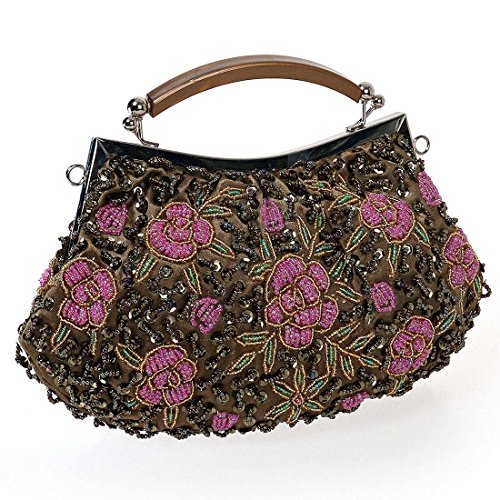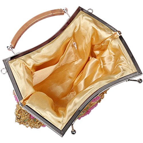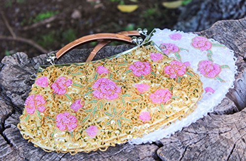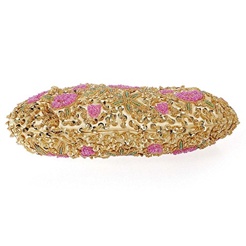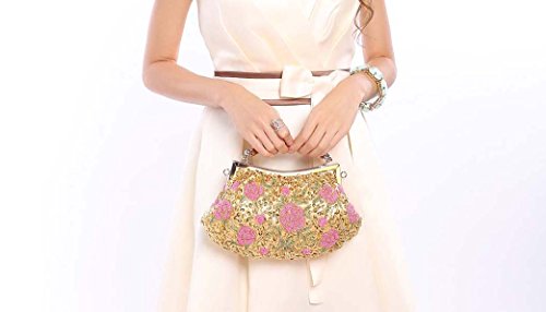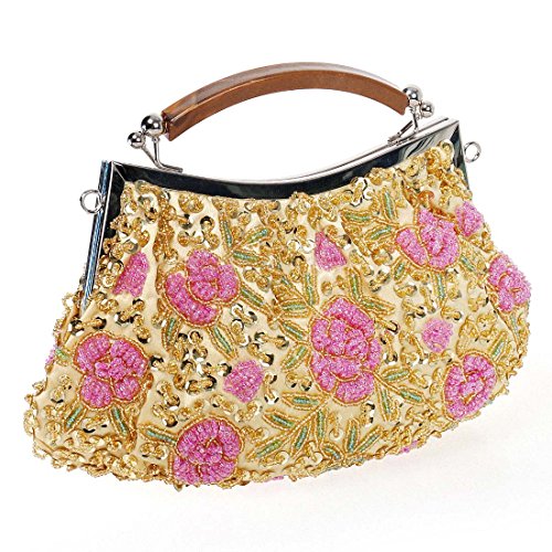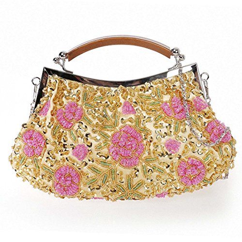 Go out in style with this elegant, tiny bead encrusted gold evening bag. The small clutch is made with soft satin material and features pink flower designs throughout the exterior. The top of the bag is framed with alloy metal and a features a plastic top handle. You can transform the clutch into a crossbody or shoulder purse by adding the removable chain. This gorgeous cocktail bag is a fashionable addition to any party look. *NOTE*: Due to differences between monitor displays, actual color may vary slightly from image. b.m.c is a registered trademark of Remi Collections LLC and is exclusively distributed by Bundle Monster. The b.m.c trademark is protected by US Trademark Law.Feature