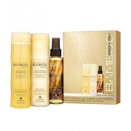 Powered by eco-certified Bamboo Extract & instantly absorbing Kendo Oil, this smoothing trio has everything you need to get strong, sleek, frizz-free hair. BAMBOO Anti-Frizz Shampoo and Conditioner immediately smooths & hydrates hair, and BAMBOO Kendo Dry Oil Mist immediately tames frizz & fly-always for hair that looks and feels healthier.Feature