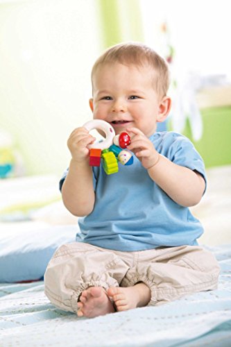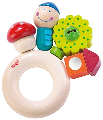 - For first grabbing and rattling. Wooden shapes threaded on elastic. Suitable for babies aged 6 months and up.