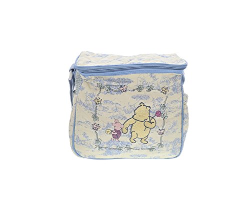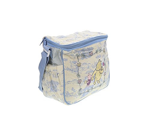 This Diaper bag has an eye catching design and is extremely functional for toting your baby's essentials around. By storing baby's bottles in the interior, or side bottle pockets, you'll never have to worry your baby's bottle spilling or making a mess. Adjustable strap for easy wearing. The world's most iconic characters, Disney's Classic Winnie the Pooh, is highlighted on this fashionable and functional diaper bag. Kids and adults love these timeless characters that are always on trend. Everyone relates to an always fun-loving Winnie the Pooh.Feature