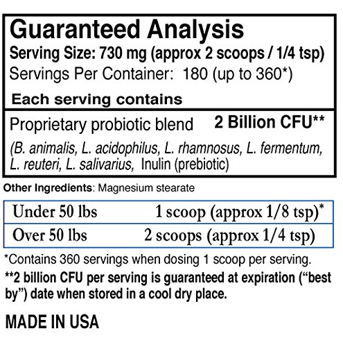 -. Feature : THE ORIGINAL PROBIOTICS FOR DOGS AND CATS: Up to 360 doses per container. Over 360 BILLION CFU of probiotics per jar. Great value and Superior Quality Probiotic Blend. / The #1 TRUSTED PROBIOTICS FOR PETS: Made in the USA, with years of consistent results combatting dog diarrhea, loose stool, yeast overgrowth, bad breath, constipation, itching & scratching, allergies, digestive issues, and gut related problems in pets. / VET RECOMMENDED - Super Concentrated - Vegetarian - No Gluten - No Dairy - No Soy - No Fillers - No Flavorings - Tasteless - Odorless. / FEEL CONFIDENT: 100% Money Back Guarantee within 60 days of purchase. Best if used within 8-10 months after purchase. / BACKED BY SCIENCE: Formulated specifically for the dietary and health needs of your dog or cat. Scientifically researched for pets and recommended by Top Breeders and Veterinarians as a #1 trusted brand in America.