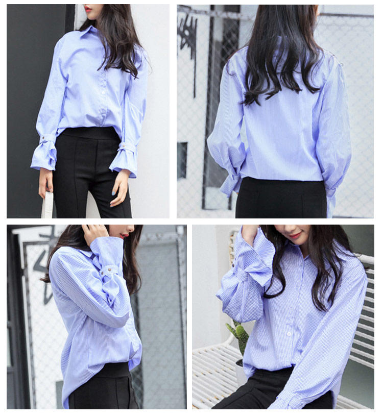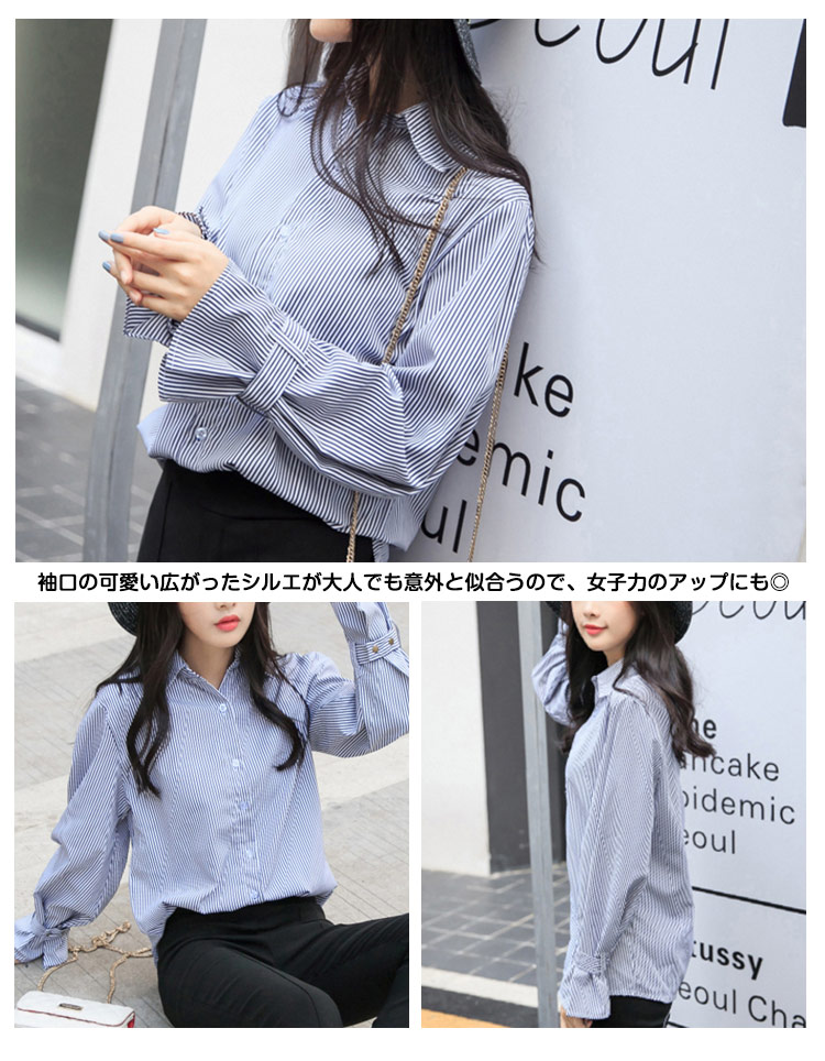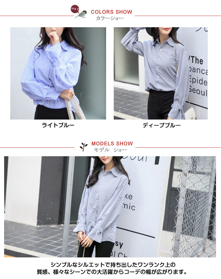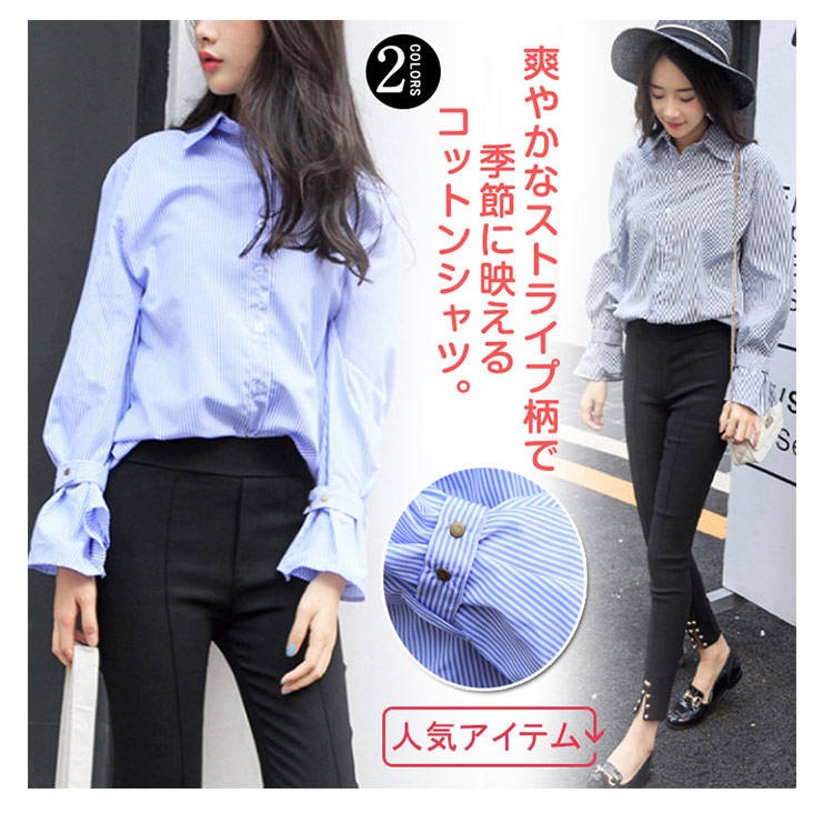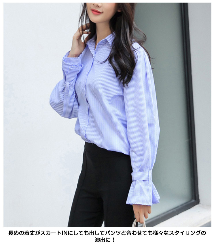 | 爽やかなストライプ柄で季節に映えるコットンシャツ。シンプルなシルエットで持ち出したワンランク上の質感、様々なシーンでの大活躍からコーデの幅が広がります。 長めの着丈がスカートINにしても出してパンツと合わせても様々なスタイリングの演出に! 袖口の可愛い広がったシルエが大人でも意外と似合うので、女子力のアップにも◎シワになりにくい素材なので、デイリー使いにもぴったり!ぜひおススメです! | |