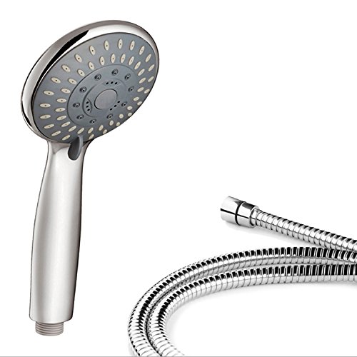 Studio : Gosear Publisher : Gosear Product Description Complet shower head set, includes hand shower head, shower head bracket holder, 1.5m shower hose and 1m tape Multifuntional, 5-settings bathroom shower head can provide you a pleasant shower experience, including following modes: rainfall shower, power massage, waterfall mist, shower with power massage, shower with waterfall mist The massage shower head will enable you to relax and enjoy a natural SPA at home after a series of working pressure The shower head is adopted high quality ABS material with plating process, making it sturdy and durable, no toxic and lead Good thermal conductivity, can withstand 70-80 degrees Celsius temperature Specification: Material: ABS plastic plating Hand shower head size: 10.5 x 24.5 cm/4.13 x 9.65 inch Package: 1 x Handheld Shower Head 1 x Shower Head Bracket Holder 1 x 1.5m Shower Hose 1 Roll x 1m Tape 0