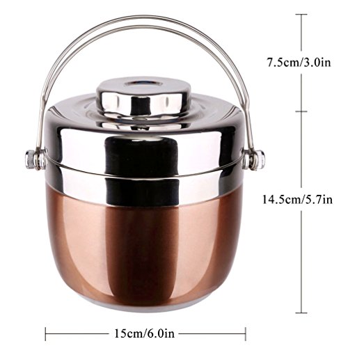 REFERENCE SIZE: Diameter:5.5inch/14cm,Height:5.7inch/14.5cm; Handle Height:3inch/7.5cm;SIZE IS LARGE FOR 2 KIDS! Holding food warm or hot for about 3 HOURS! To use the lunch box with the lunch bag coming with will help to hold food longer!