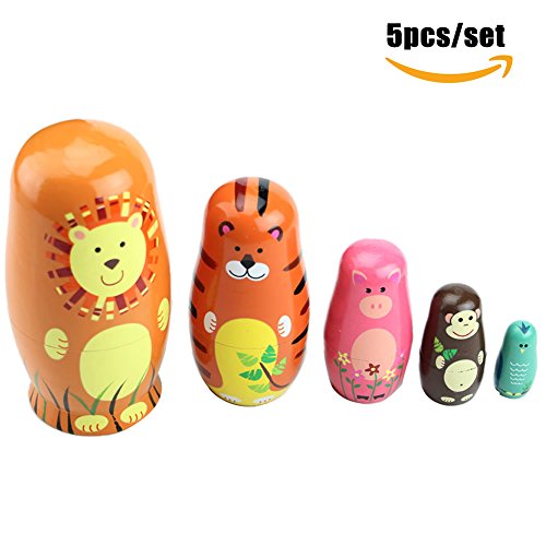 -. Title : Nesting Dolls, Handmade Wooden Cute Animals, 6-inch, Set of 5pcs, by Delight eShop