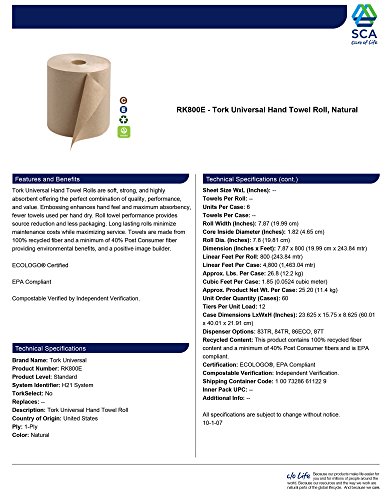 -. Feature : Tork Universal Hand Towel Rolls are strong and highly absorbent - offering the perfect combination of performance and value / Includes paper towel embossing to enhance hand feel and provide maximum absorbency with fewer towels used per hand dry / Long-lasting rolls of 800 linear feet for high-capacity dispensers to minimize maintenance costs while maximizing service / EcoLogo Certified, EPA Compliant, Compostable, and made from 100 percent recycled material, with a minimum of 40 percent post-consumer fibers, providing environmental benefits and a positive image builder / For use with the Tork 84TR, 83TR, 86ECO, and 87T roll towel dispensers