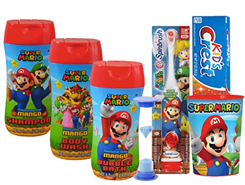 -. Feature : (1) Mario 8oz Shampoo in Bottle (1) Mario 8oz Bubble Bath in Bottle (1) Mario 8oz Body Wash in Bottle / (1) Arm & Hammer Kid's Spinbrush Super Mario Powered Toothbrush (Batteries Included) (1) Crest Kids Cavity Protection Sparkle Fun Toothpaste, 2.7-oz. Tube (1) Nintento Super Mario 16oz Plastic Mouthwash Rinse Cup (1) Dentist Rec. 2 Min Brushing Timer!