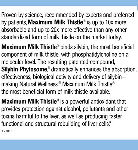 -. Binding : Health and Beauty -. Brand : Natural Wellness -. Feature : Patented formula that is scientifically proven to be up to 10X MORE ABSORBABLE & UP TO 20X MORE EFFECTIVE than standard milk thistle formulas for much less than 20 times the price. / Rebuilds and produces new liver tissue and cells faster than standard milk thistle formulas. / Maximizes your liver protection against alcohol, pollutants and all forms of toxins. / Supports your liver's function in fat, carbohydrate and protein metabolism, and storage of vitamins and minerals. / Destroys free radicals and reduces inflammation and oxidative stress. -. IsAdultProduct : 0 -. Label : Natural Wellness -. LegalDisclaimer : These statements have not been evaluated by the FDA. This product is not intended to diagnose, treat, cure or prevent any disease. -. Manufacturer : Natural Wellness -. MPN : N100 -. PackageQuantity : 1 -. PartNumber : N100 -. ProductGroup : Health and Beauty -. ProductTypeName : HEALTH_PERSONAL_CARE -. Publisher : Natural Wellness -. Studio : Natural Wellness -. Title : Milk Thistle - 10x More Absorbable, 20x More Effective - Maximum Milk Thistle by Natural Wellness