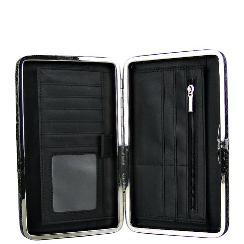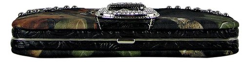 Bifold Metal Frame Wallet Belt Buckle Decoration with a Brown Trim on Front with Soft Camouflage Background Decorated with Rhinestones Easy Push Button Open Credit Card or Business Card Slots Pic ID Windows Checkbook Cover Included Back, Magnetic Closure Pocket Note: Camo Pattern/Picture may differ from the one pictured.