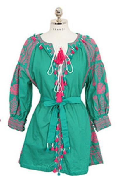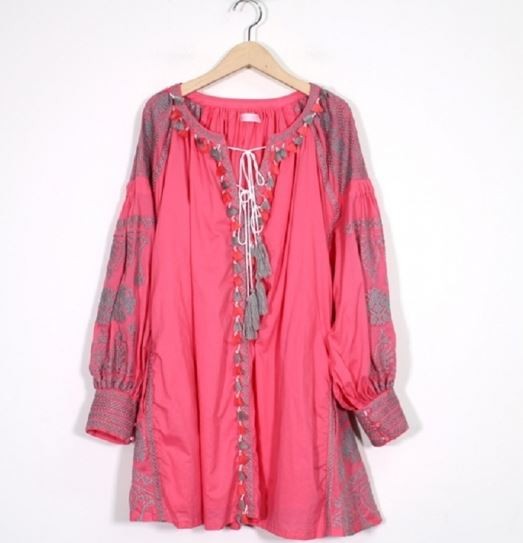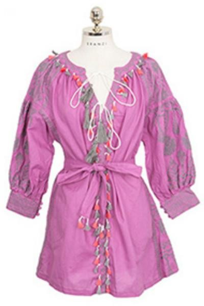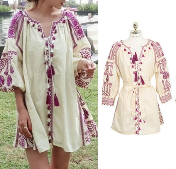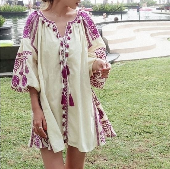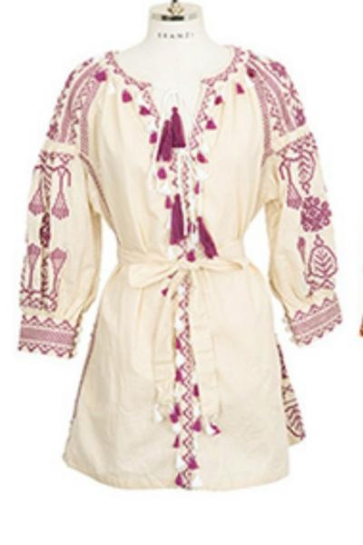 レトロ フリンジ&クロス刺繍 ランタンスリーブ フォークロアワンピース/ ベージュ