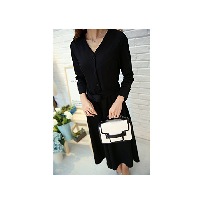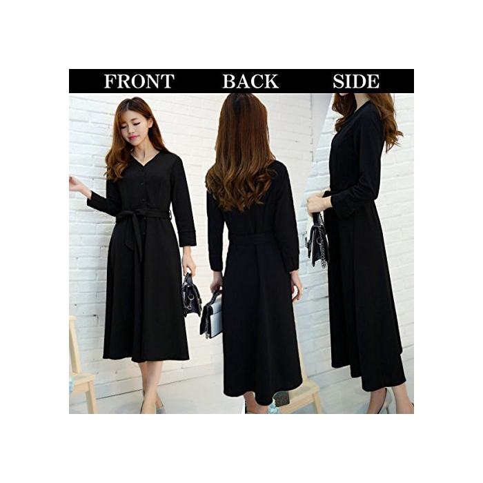 (배푸) PEPU 플레어 원피스 레이디스 예쁜 슬키 V넥 웨스트 리본 롱 블랙 검정 포멀 드레스 7 분소매