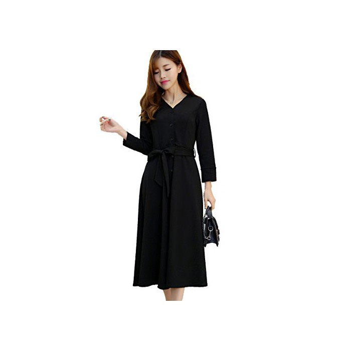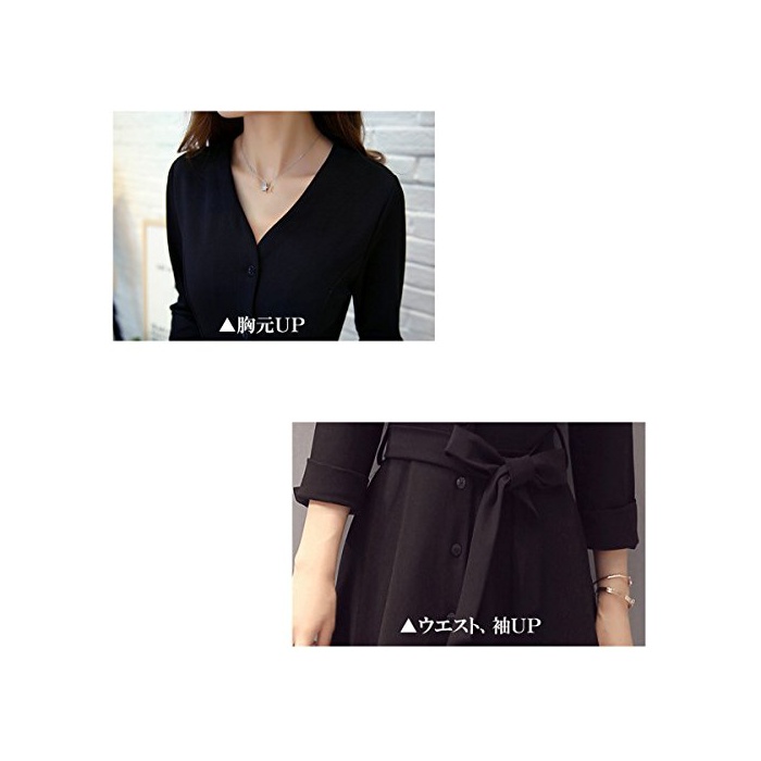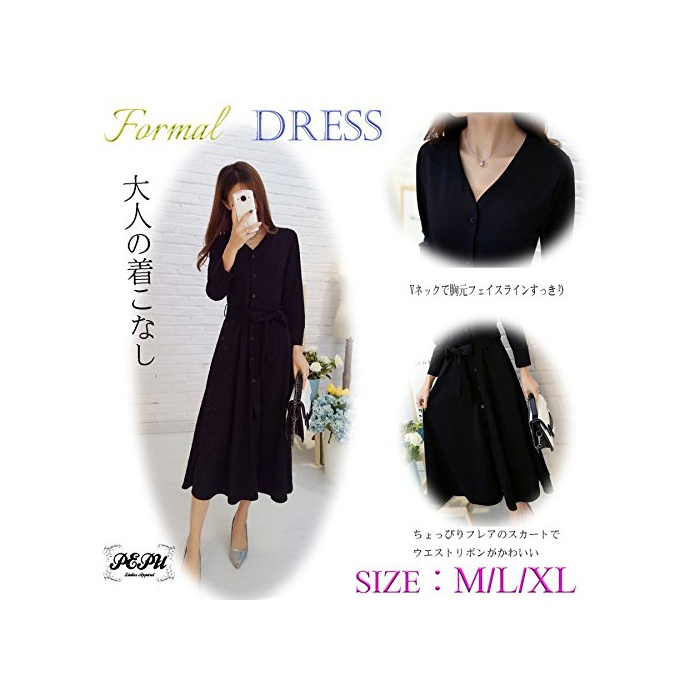 원본상품명: (ペプ) PEPU フレア ワンピ?ス レディ?ス きれいめ 膝丈 Vネック ウエスト リボン ロング ブラック ? フォ?マル ドレス 七分袖