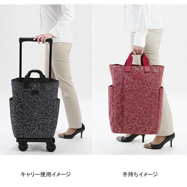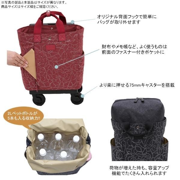| 仕様 | ●バッグ最大積載量:15kg ●最大容量:約21L(通常:15L、容量アップ部:6L) ●ハンドル高:6段階(90cm、85cm、80cm、75cm、70cm、65cm) ●持ち手立ち上がり:約11cm ●75mm交換式キャスター ●アウトフレーム ●バッグ単体使用可 ●撥水加工 ●オリジナル背面フック ●B4収納サイズ ●日本国内線機内持ち込み可(座席数100席以上の飛行機のみ) |