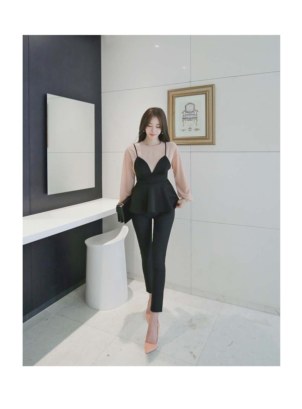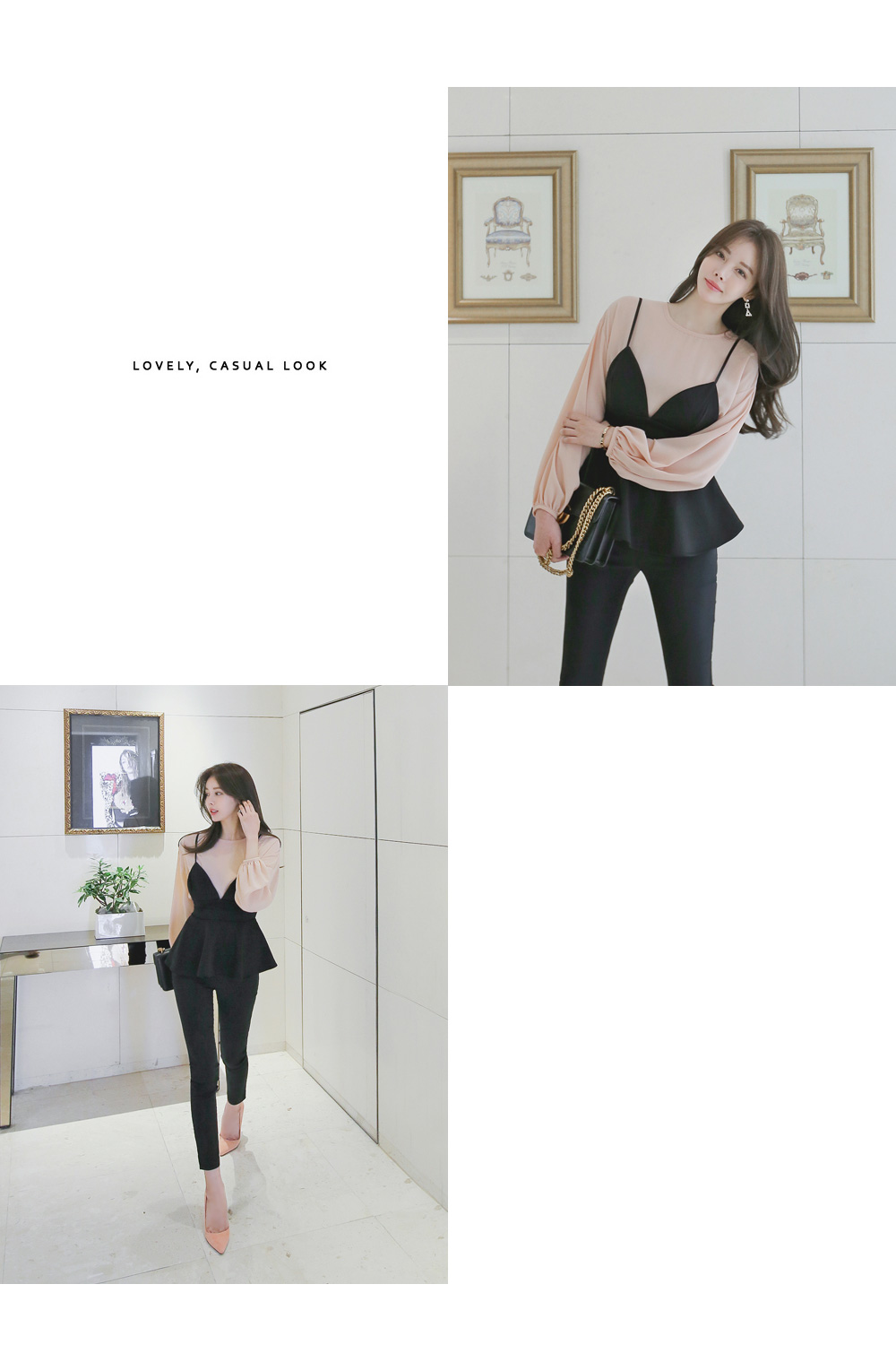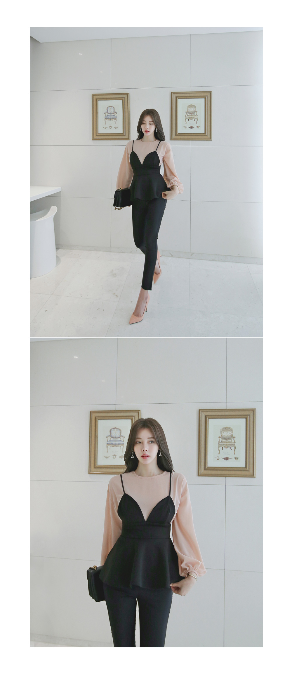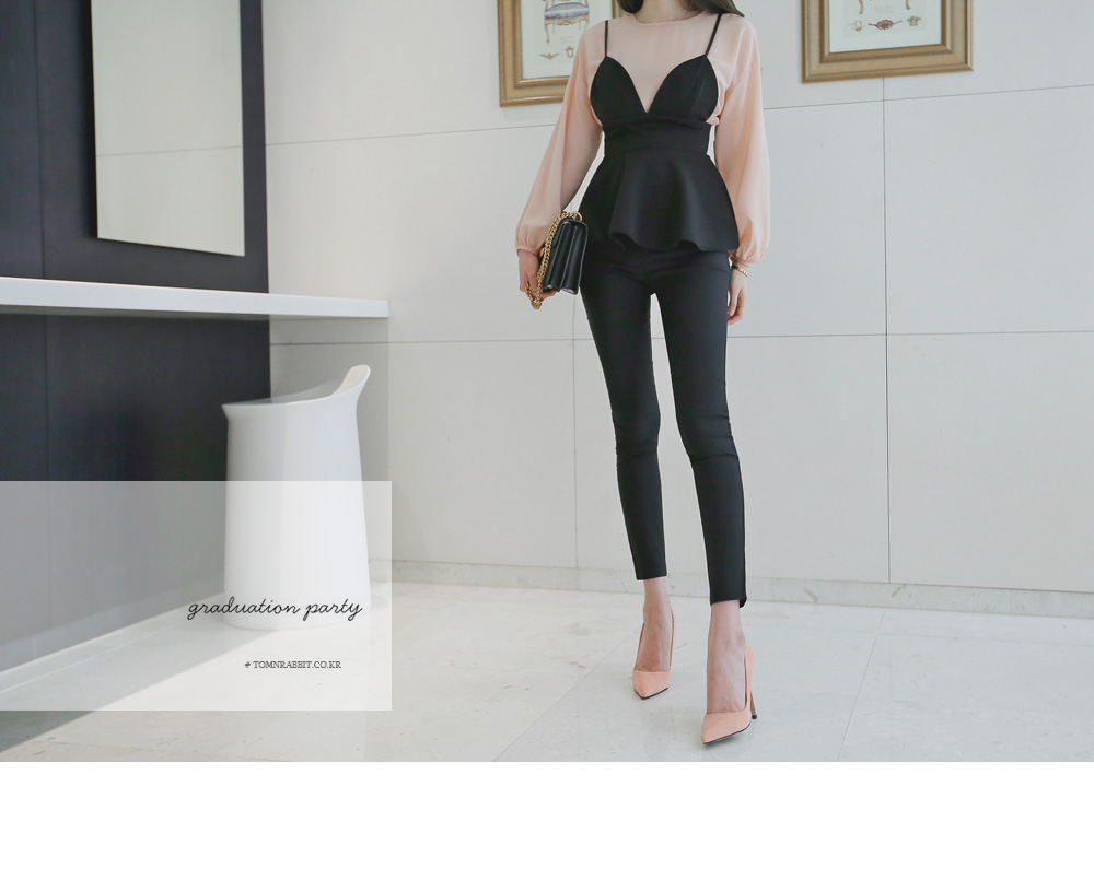 모델과 함께 블라우스 탑과 함꼐 연출해주시거나 셔츠나 후드탑등