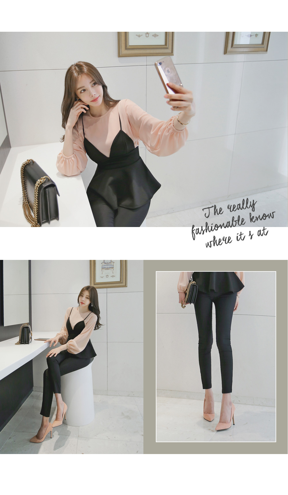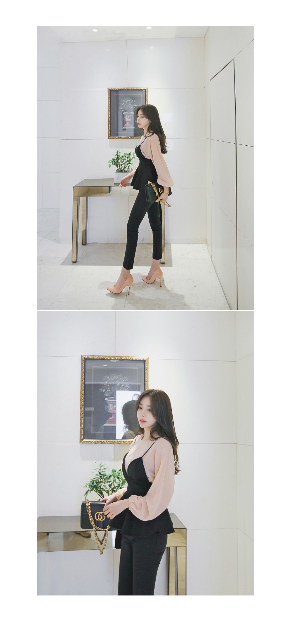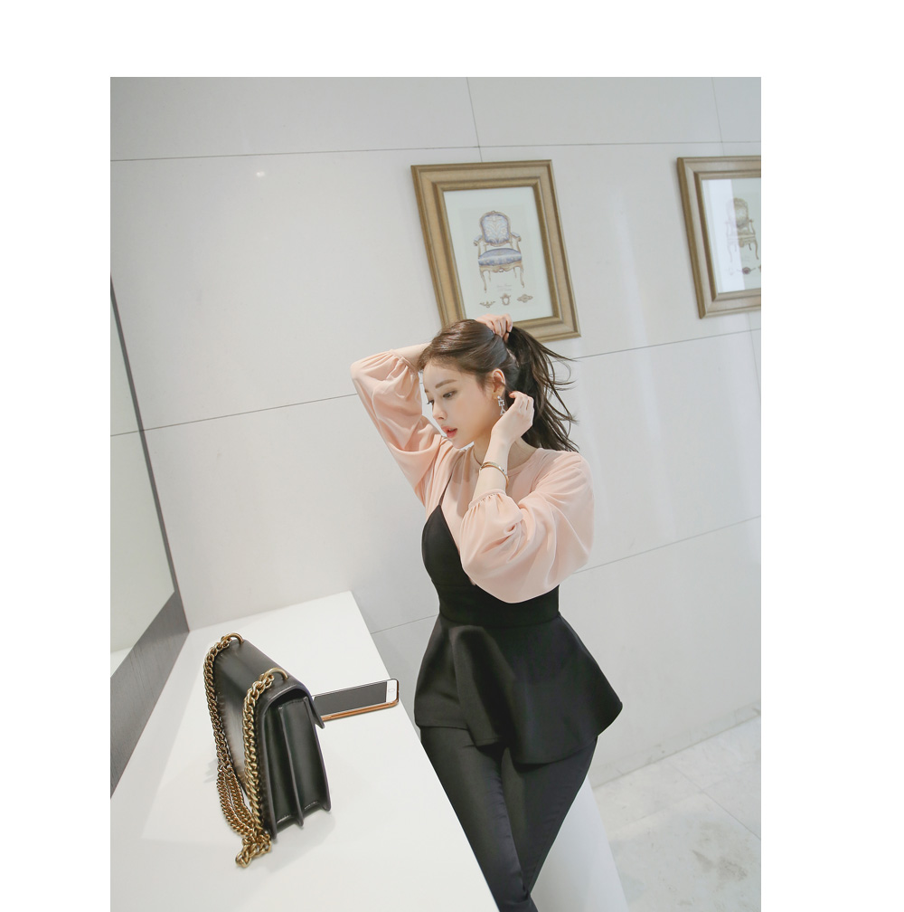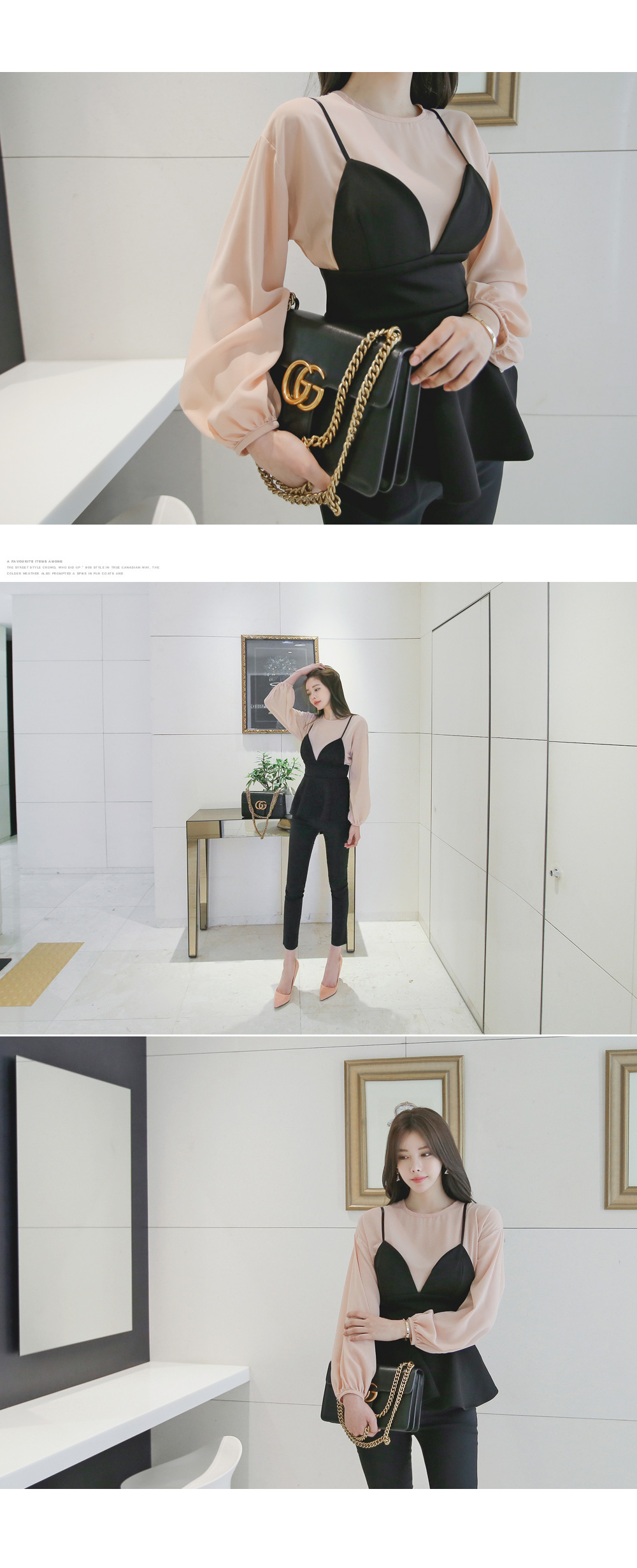 모델과 함께 블라우스 탑과 함꼐 연출해주시거나 셔츠나 후드탑등
