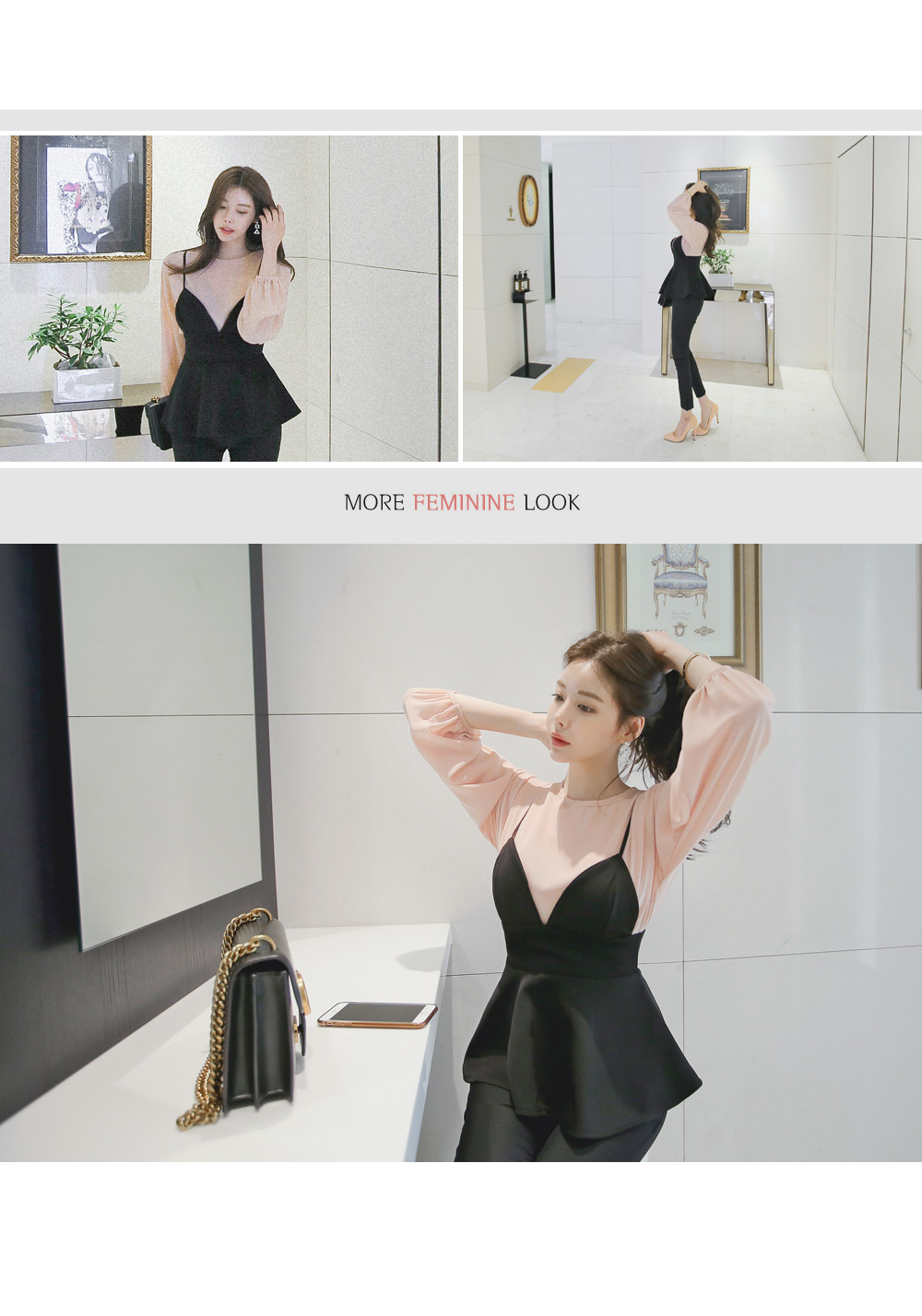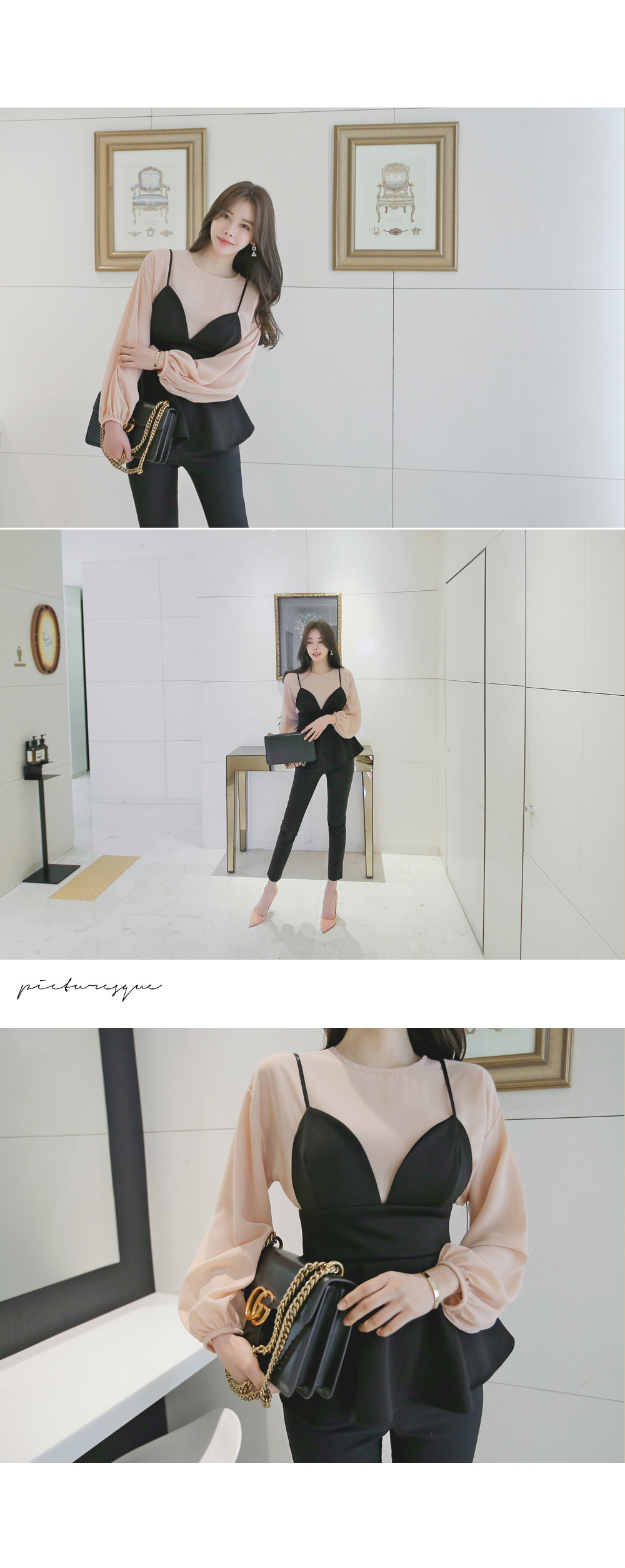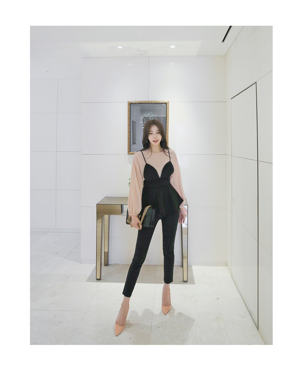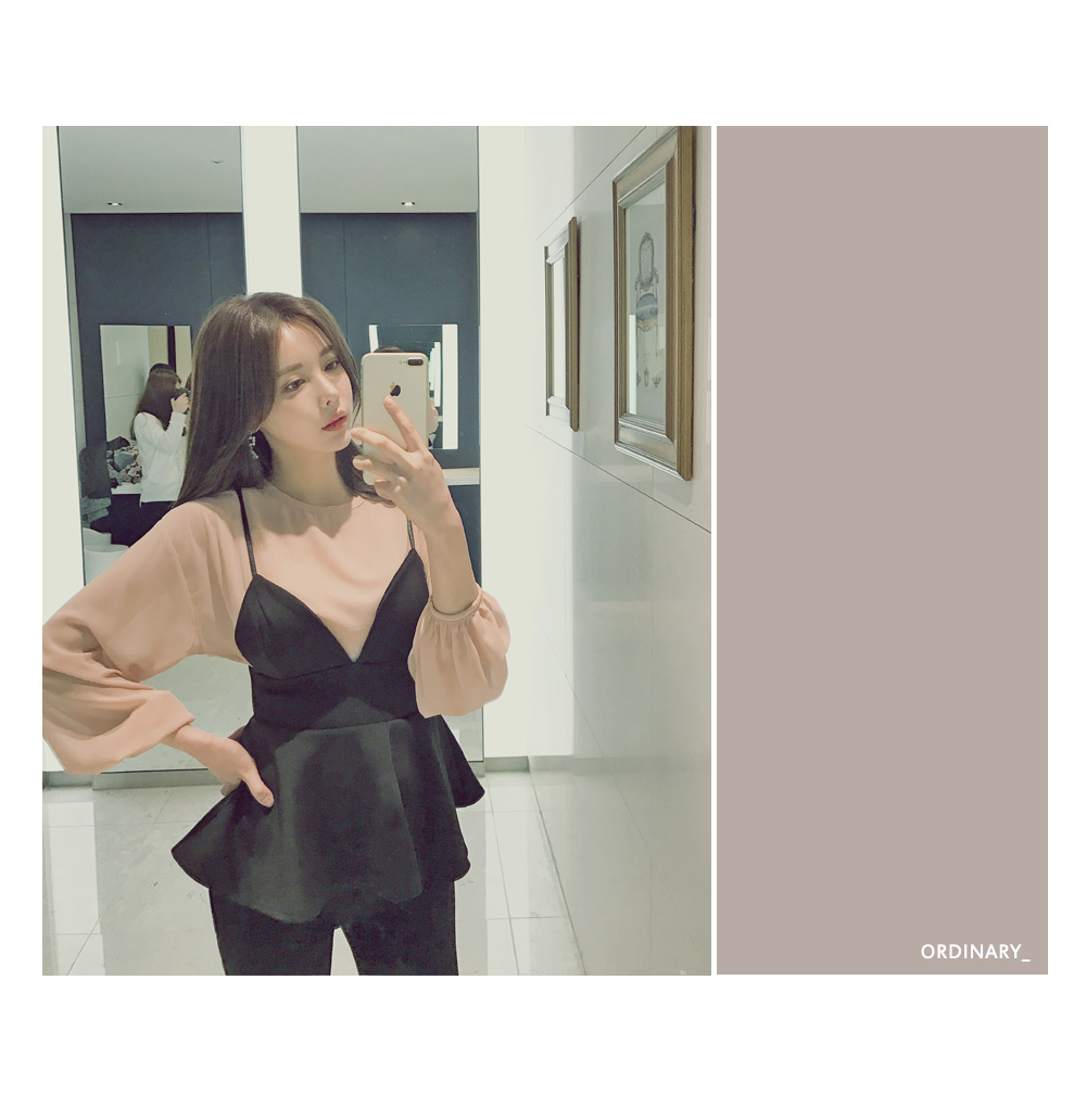 모델과 함께 블라우스 탑과 함꼐 연출해주시거나 셔츠나 후드탑등