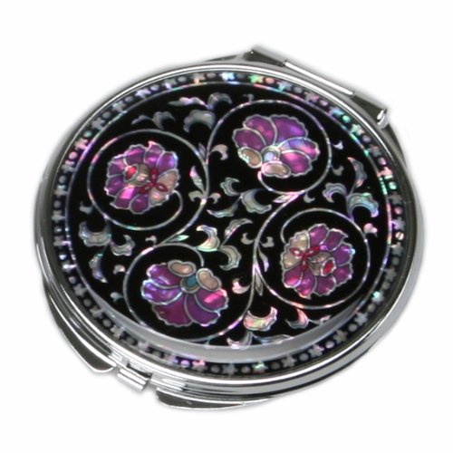 Mother of Pearl Purple Flower Black Double Compact Handbag Purse Makeup Cosmetic Pocket Hand Mirror, 3.2 Ounce