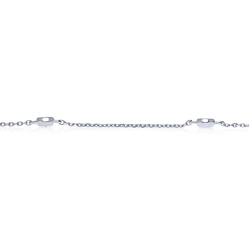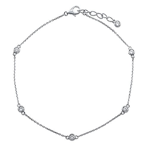 This cz by the yard station anklet delicately adorns the ankle with soft, polished elegance. Made of rhodium plated fine 925 sterling silver. Set with 0.66 carat round cut clear cubic zirconia (3mm) in bezel setting. Anklet measures 10 inch with 1 inch extension in length, 1mm in width. Lobster claw clasp. Imported.