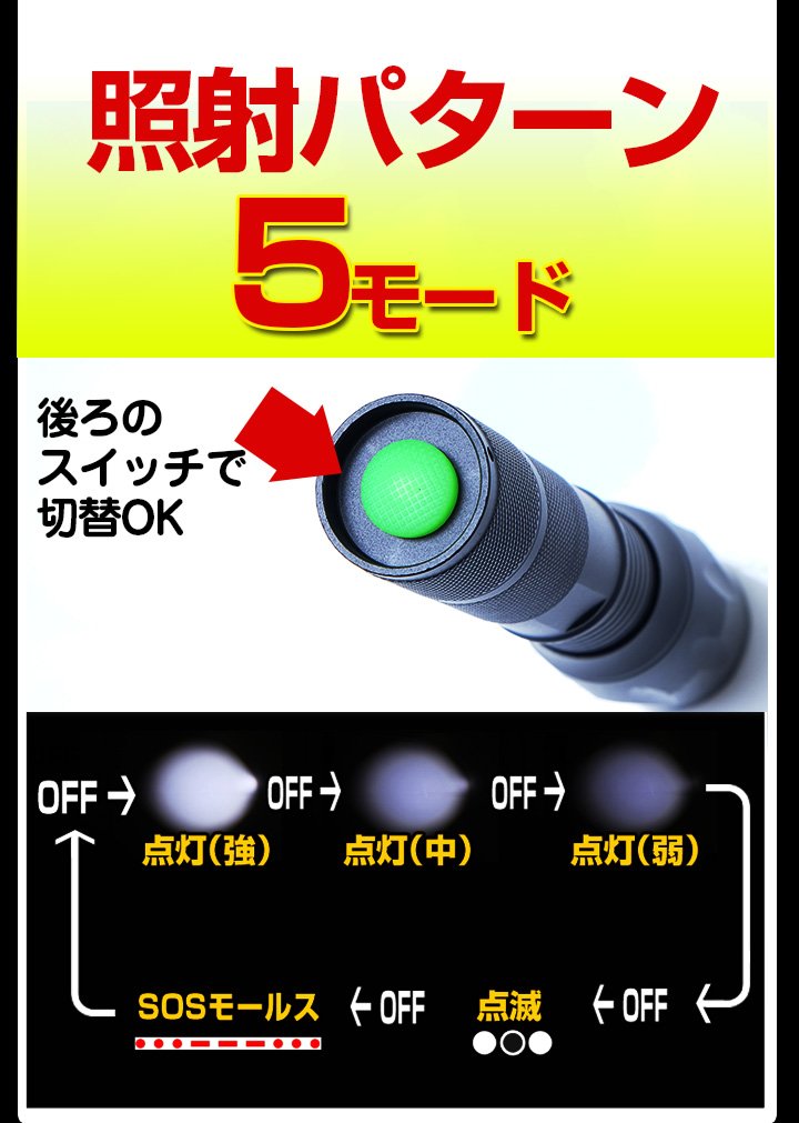 5 modes including strobe (daily use to outdoor and occupational use to SOS mode) are included.