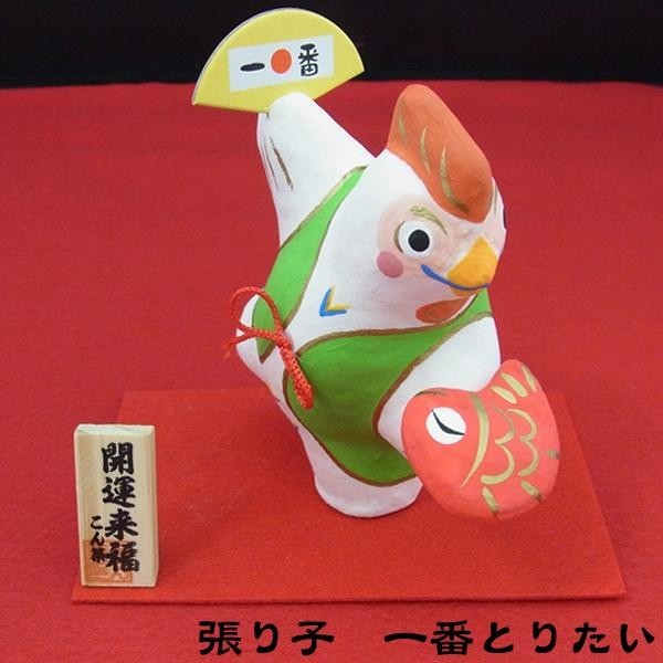 1本足でしっかり立っている「酉」の置物。手にはめでたい鯛を持ち、扇子を広げて踊っている楽しい姿です。立札と毛氈付きです。玄関やお部屋のインテリアに最適♪ |
