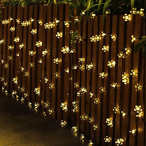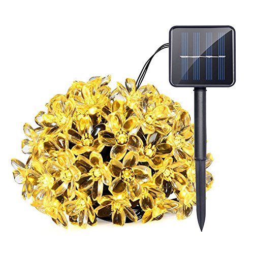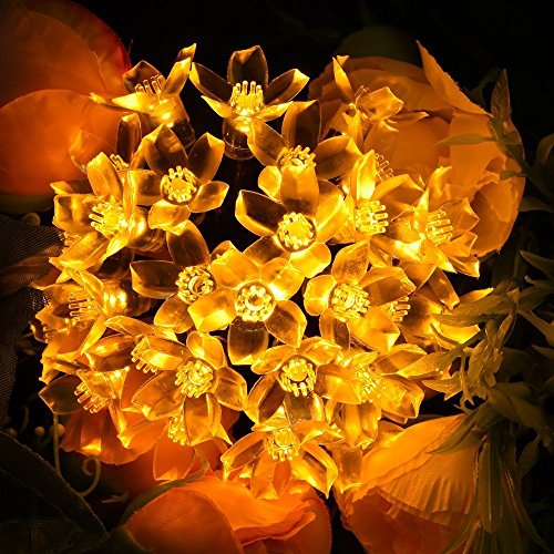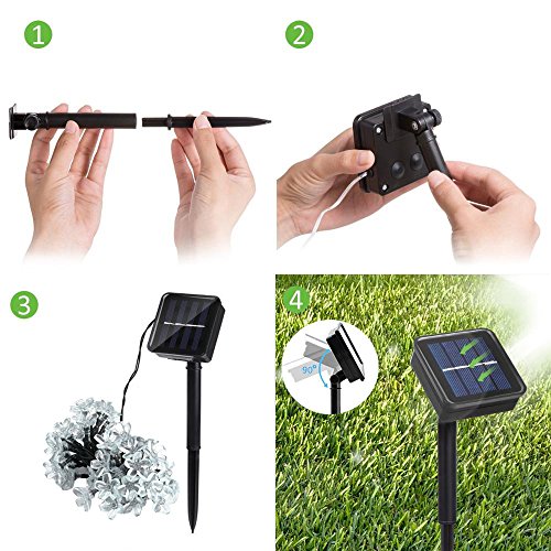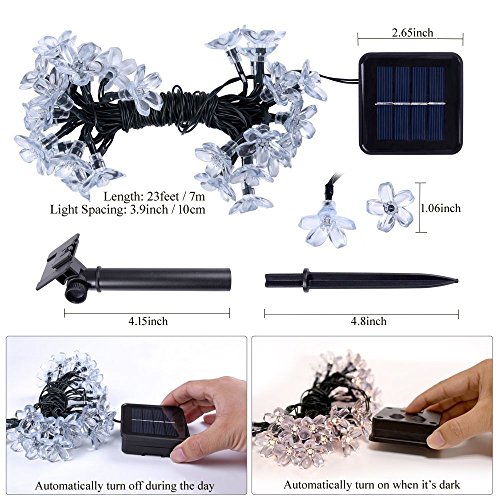 -. Feature : Perfect Holiday Decorative Lights: The solar string lights illuminate during night, add romantic and charming atmosphere to your home, patio, lawn, garden, etc / Solar Powered String lights: 50 led flower blossom lights on a 23ft light strand (6.5ft lead cable included), solar panel(2V/100mA) with built-in 600mA NI-MH battery / Long Working Time: Solar panel convert sunshine into electricity during the day, and it lights up automatically at night for more than 8 hours if solar panel absorbs enough sunlight during day / Easy to Operate & Install: Low voltage power, non plug-in, solar panel with garden stakes stand, 2 switches, On/Off and Mode (Steady/Flashing) / Waterproof Flower Outdoor Lights - 23ft(6.5ft lead cable included) 50 led outdoor lights can withstand all kinds of weather, including heavy rain and snow