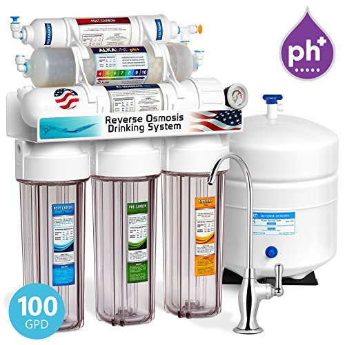 Express Water ROALK10DCG 10 Stage Home Drinking Filtration System Alkaline pH+ Reverse Osmosis 100 GPD RO Membrane, Clear Housing, Deluxe Chrome Faucet, Pressure Gauge, BPA Free