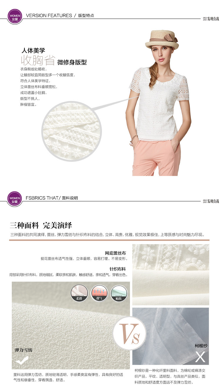 精雕细琢质感绣花蕾丝,立体感十足,前身蕾丝整片覆盖,似花丛的精灵般充满灵气,设计生动活泼,赋予女性优雅气质。整体采用微修身版型,修饰身材比例。三种面料的合理搭配使得服装精品质高等,棉料的运用,让T恤变得轻薄凉爽起来,飘逸无比。