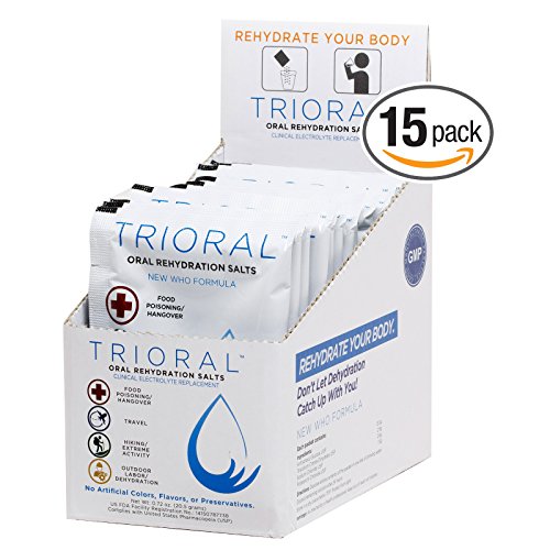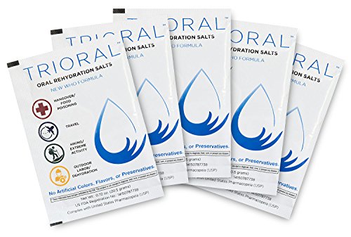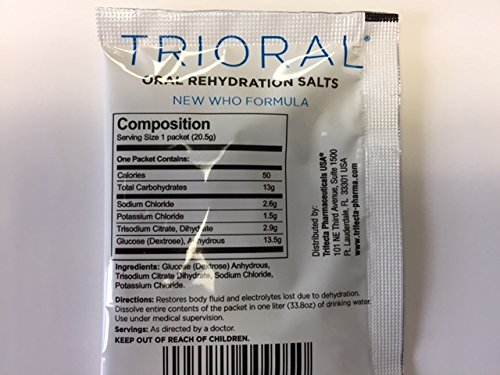 Studio : Trifecta Pharmaceuticals USA Publisher : Trifecta Pharmaceuticals USA Binding : Health and Beauty Product Description WHO Approved Reduced Osmolarity Oral Rehydration Salts 20.5g/0.72 oz Powder Packet. (NEW FORMULA). Manufactured according to Pharmaceutical Good Manufacturing Practices (GMP). The new improved formula is the result of extensive research sponsored by WHO's Department of Child and Adolescent Health and Development and supported by the United States Agency for International Development (USAID). What exactly are TRIORAL Oral Rehydration Salts (ORS)? TRIORAL ORS are effective, inexpensive, safe and convenient packets of pre-formulated salts/ sugar when mixed with water will rehydrate your body fast, regardless of the cause. Each TRIORAL ORS packet is a sealed, pre-measured and pre-formulated powder that contains: Glucose anhydrous 13.5g, Trisodium Citrate Dehydrate 2.9g, Sodium Chloride 2.6g and Potassium Chloride 1.5g. How does TRIORAL ORS work and why are these electrolytes important? This combination of electrolytes with glucose optimizes efficient absorption via the intestinal tract. With TRIORAL ORS both the active transport of glucose and diffusion of salts/water through the intestinal lining are at work-- so you rehydrate fast. Dehydration may occur unexpectedly and rapidly as a result of excessive fluid loss due to sweating, urination, fever, etc. When the body is depleted of critical salts and water, severe dehydration many ensue, resulting in acute medical emergencies. How should I take the TRIORAL ORS packets? Empty completely one TRIORAL ORS packet into one liter of water. Only open the sealed packet when you are ready to mix with water and drink it. Since it contains NO artificial sweeteners or flavoring agents, at your discretion, you can squeeze a lemon, lime or orange to taste. If recommended by a physician, pharmacist or other health professional, follow his/her instructions. 0