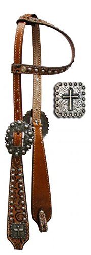 Studio : Shiloh Publisher : Shiloh Binding : Misc. Product Description Showman ® One Ear Headstall with Brown Filigree Print. This double stitched leather headstall features brown filigree print on cheeks and ear piece accented with studs. Large engraved buckle on both sides and engraved cross conchos. Headstall comes with 5/8" x 7' reins. s. 0