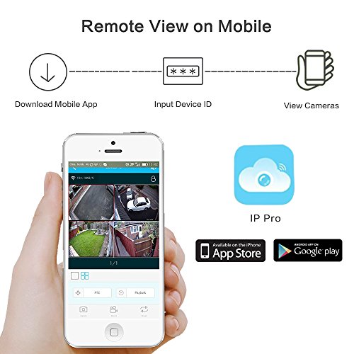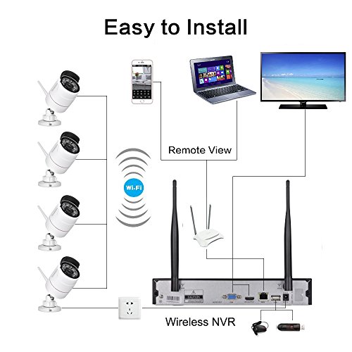 -. Feature : Newest 4 Channel 1080p Wireless Surveillance System Brings you High Definition Visual Field with 1920*1080p Crystal Clear Video Image. Better than other 720P, 960P, and 1000TVL Cameras. / NOTED: All cameras and NVR Recorder need Plug Power Supply Cable,But don't need Ethernet Cables or Video Cables. Plug and Play: 4 Wireless Camera Auto Pair with the NVR Video Recorder Once pled into the power supply, Instantly See Video Live on your Monitor. Say goodbye to Traditional complex setup and cables! Hard drive does not included in package / See Clearly in Dark: 2.0 Megapixel Outdoor Cameras built in New Generation Array Led Durable and Clear Night Vision up to 100ft / Remote View On Smartphone App and Computer Software. You Only need to Add Device ID. Manual Recording, Recording By Schedule, Advanced Motion Detection Recording settings to save hard drive space. Get notified when something happens with intelligent email alerts and app notification. / Easy USB Backup feature if you want to backup footage for evidence. High quality product, CE FCC UL Certificated Adapters. 3 Years Quality Warranty and 24 hours online service team.