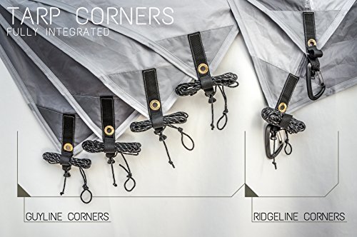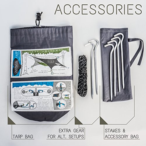 ALL-INCLUSIVE DESIGN: Rainfly accessories include 6 aluminum stakes, tarp bag, stake bag, 2 Aluminum carabiners, and over 90 feet of durable reflective guylines (2x26 ft ridgelines, 4x10 ft guylines). Heavy-duty, reinforced tarp corners include corrosion resistant grommets, nylon loops, velcro line stow-straps, and integrated Lineloc tensioners. Engineered for quick set-up on the fly!