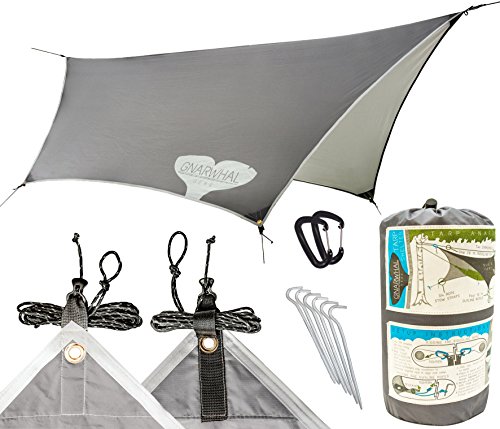 EXTREMELY VERSATILE TARP: Set up a weatherproof shelter for your hammock, tent, or campsite. Protect your equipment and camp kitchen during a storm. Erect with tarp poles on the beach or in a park to provide a shade haven. When the weather gets GNARLY, depend on GNARWHAL GEAR.