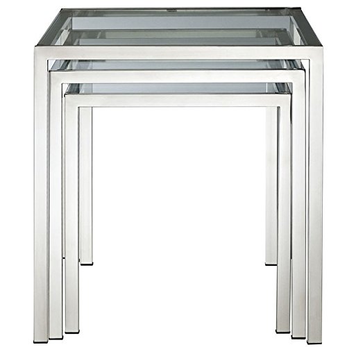 -. Feature : Beautiful stainless steel frames / Durable, tempered glass tops / Ideal for smaller rooms / Set includes 3 nesting tables