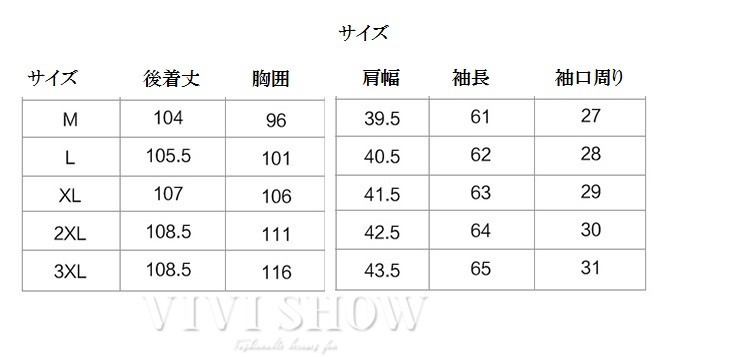 XXXL:バスト:116cm,後着丈:108.5cm, 肩幅:43.5cm;袖長65cm