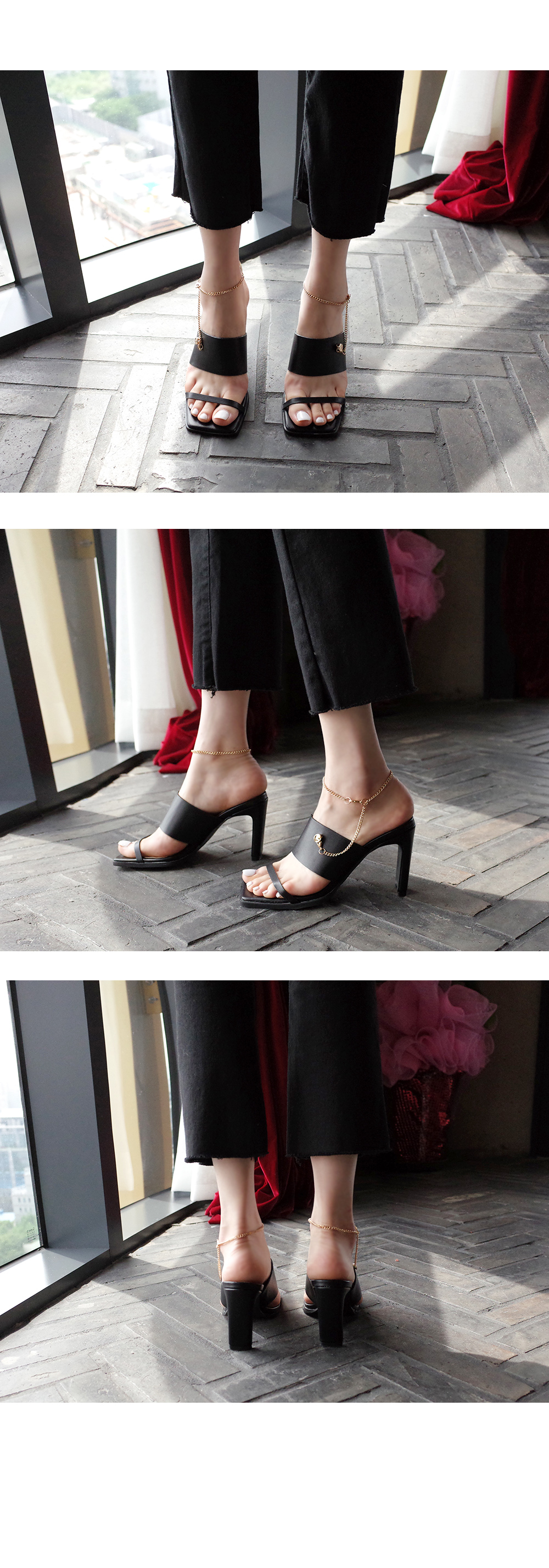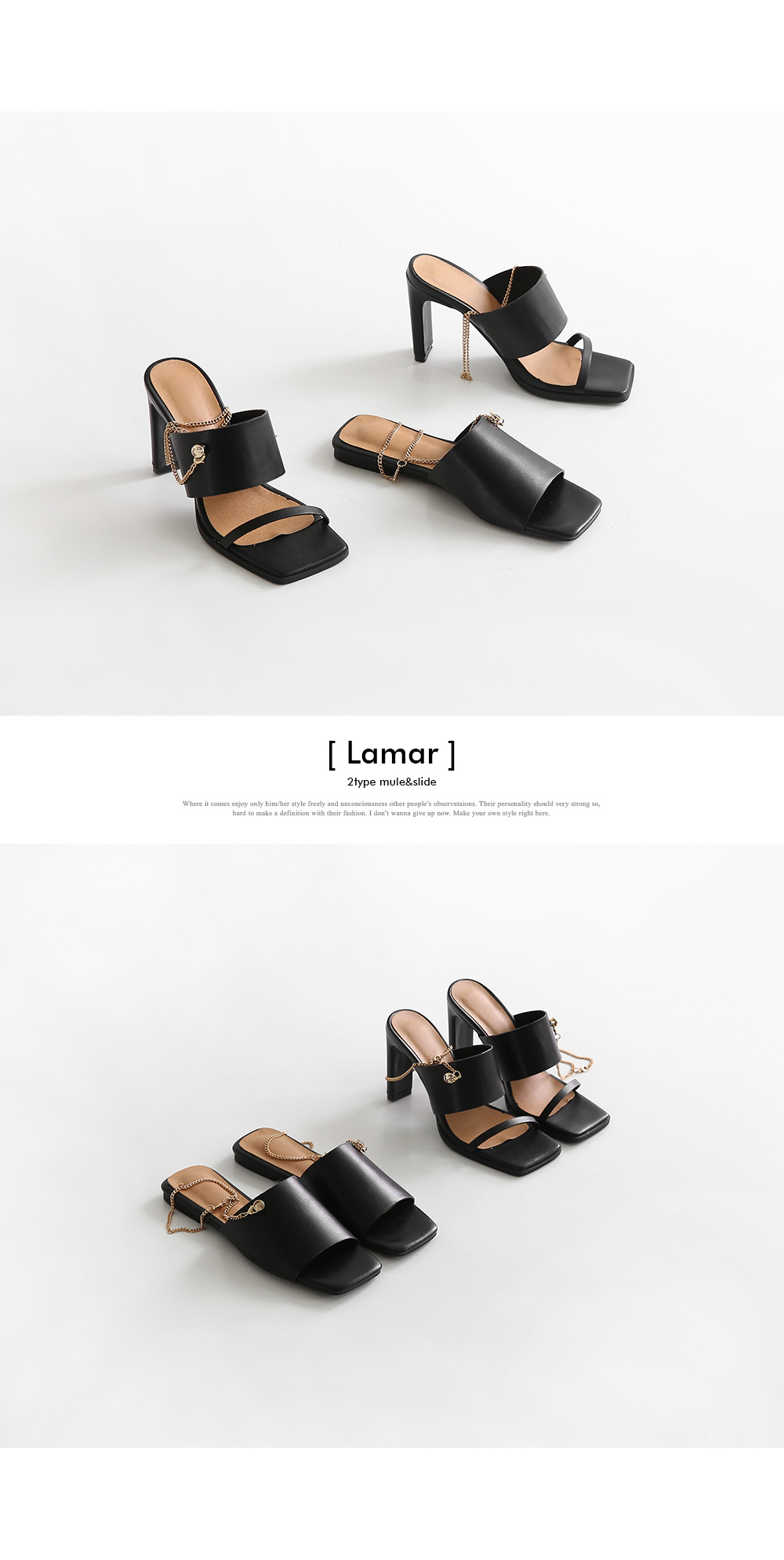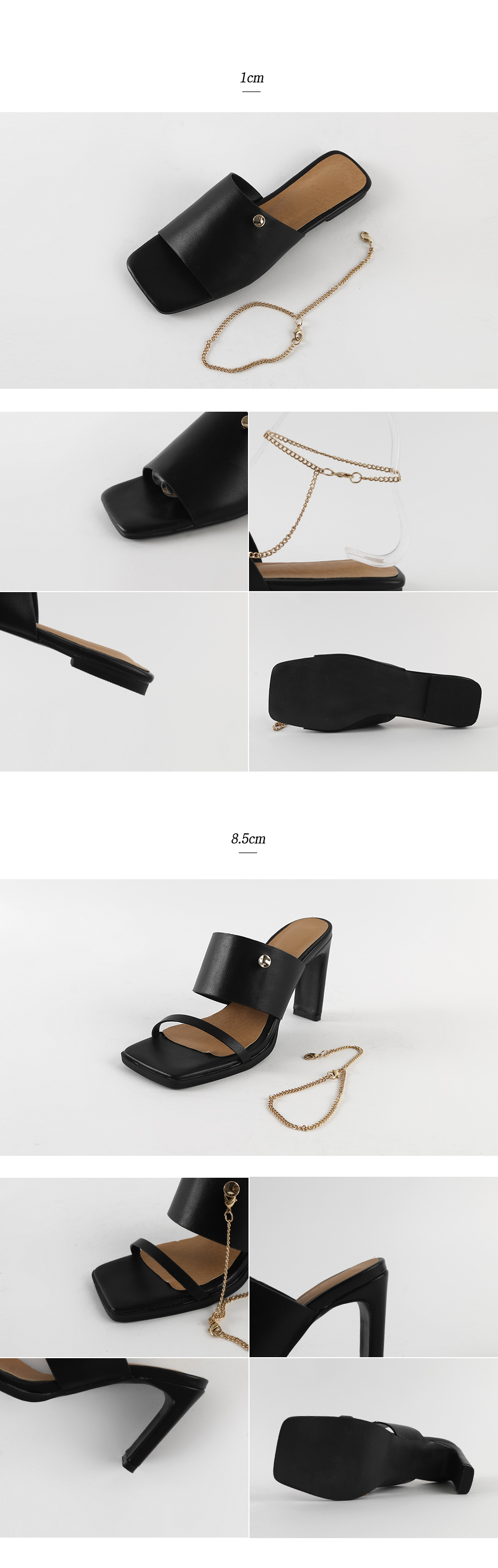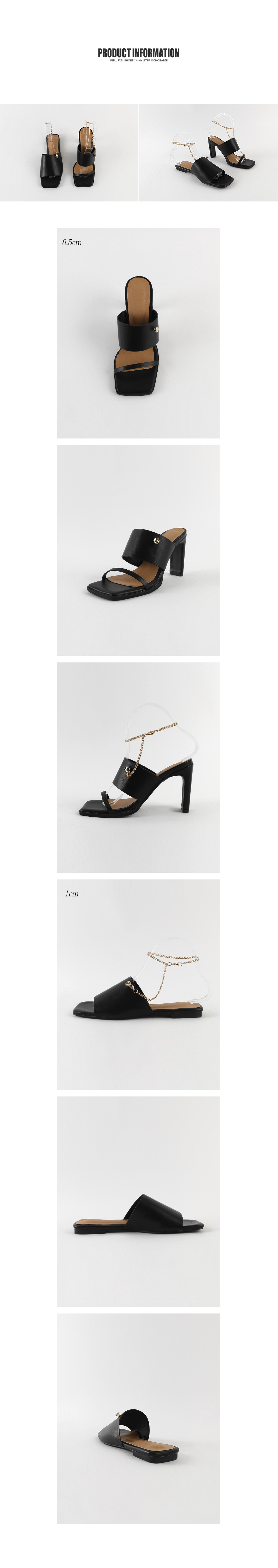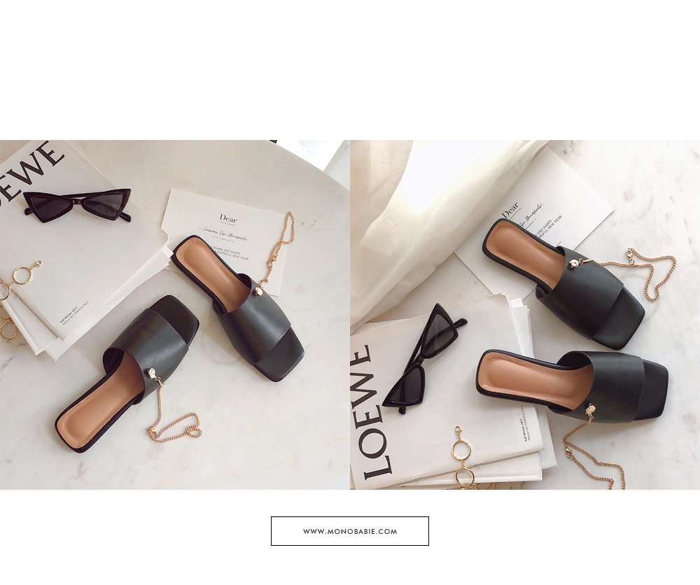 뮬과 슬라이드 두가지타입으로 제작된 제품으로 매트한 텍스쳐의 블랙컬러와 체인디테일이 굉장히 잘 녹아듭니다.