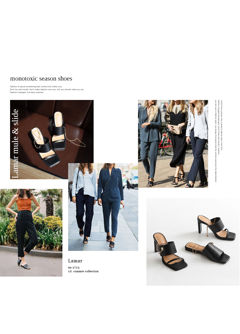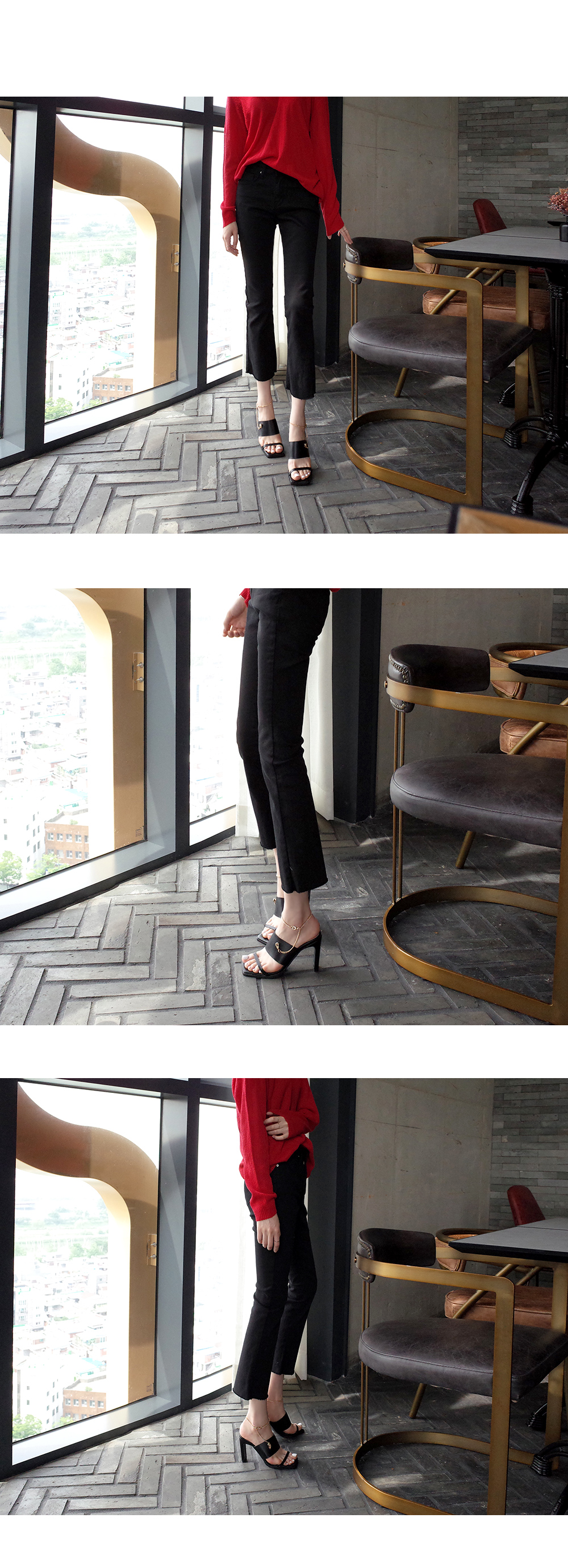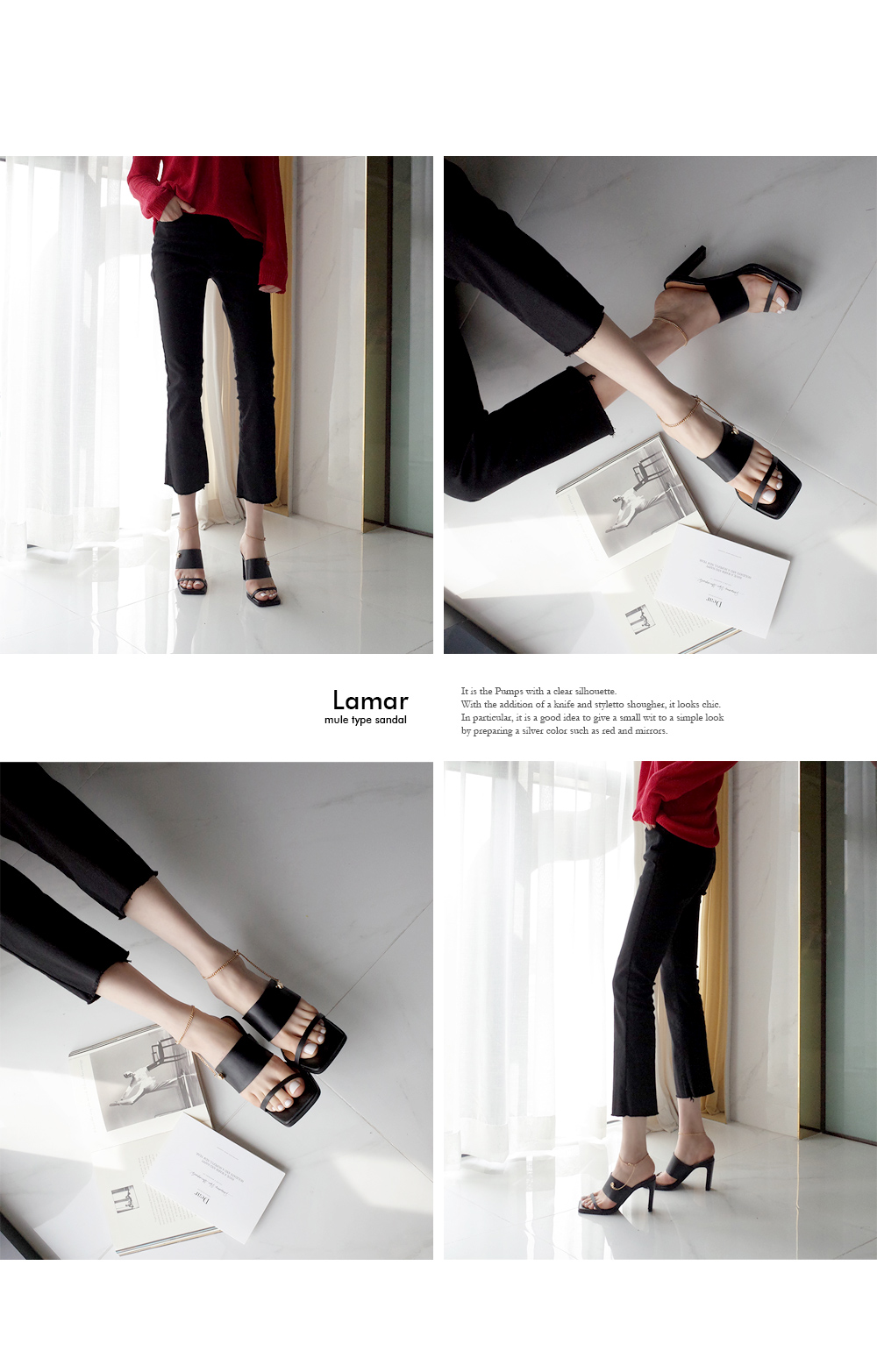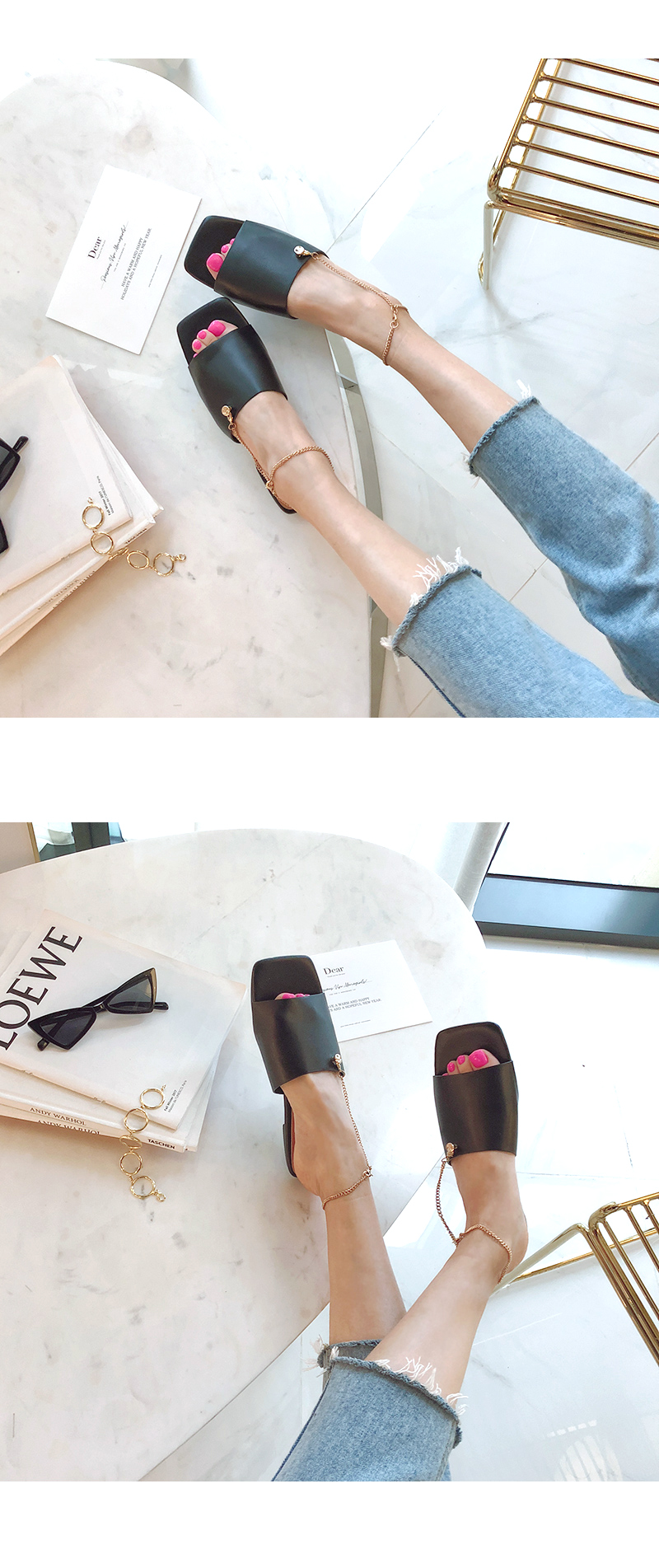 뮬과 슬라이드 두가지타입으로 제작된 제품으로 매트한 텍스쳐의 블랙컬러와 체인디테일이 굉장히 잘 녹아듭니다.