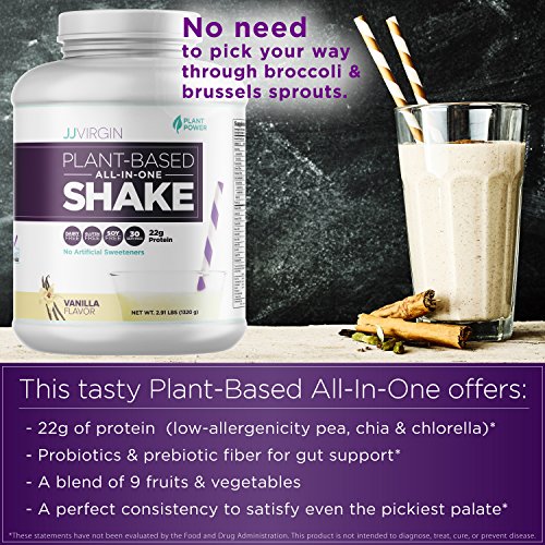 -. Binding : Health and Beauty -. Brand : JJ VIRGIN -. Feature : PREMIER PLANT-BASED PROTEIN SHAKE: Our delicious blend of pea protein isolate, chia, and chlorella gives you 22g of protein. Dairy-free, gluten-free, corn-free, aspartame-free with no artificial sweeteners or artificial colors. * / HIGH PERFORMANCE PROTEIN FOR WEIGHT LOSS: Welcome to a protein powder that includes the immunity-boosting power of probiotics! A healthy gut does much more than digest your food. Its also one of the key factors in immune health, not to mention the production of building blocks for hormones and neurotransmitters that determine your mood, sleep, appetite, and sex drive. Drink a shake daily to give your gut flora a helping hand as they fight inflammation and work to keep you happy and healthy. / DRINK YOUR FRUITS AND VEGGIES: Plant-Based All-In-One Shakes contain everything you need to build and maintain great health, all while enjoying your choice of decadent chocolate, creamy vanilla, or spicy chai. Includes the protein and probiotics you need to burn fat, build muscles, and feel your best! / TASTES DELICIOUS: Add 2 scoops of All-In-One Shake powder to your blender, along with a cup of frozen fruits and/or leafy greens. Next, add a scoop of Extra Fiber or 1-2 tablespoons of freshly ground flaxseed or chia seeds to keep you feeling full and burning fat. In a rush? Just add to water, milk, or your favorite nut milk! / FROM NEW YORK TIMES BESTSELLER & CELEBRITY NUTRITIONIST JJ VIRGIN: Known for her bestselling books The Virgin Diet and The Virgin Diet Cookbook, JJ Virgin has transformed the lives of many with her tasty line of nutritious shakes and bars, as well as exceptionally high-quality supplements. Trust her to provide highly effective and bioavailable products of the utmost quality. -. ProductGroup : Health and Beauty -. ProductTypeName : HEALTH_PERSONAL_CARE -. Title : JJ Virgin VANILLA Plant Based All In One Protein Powder Shake (Brand New Packaging)