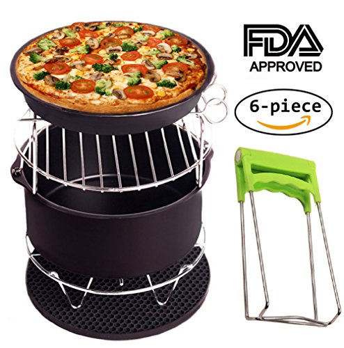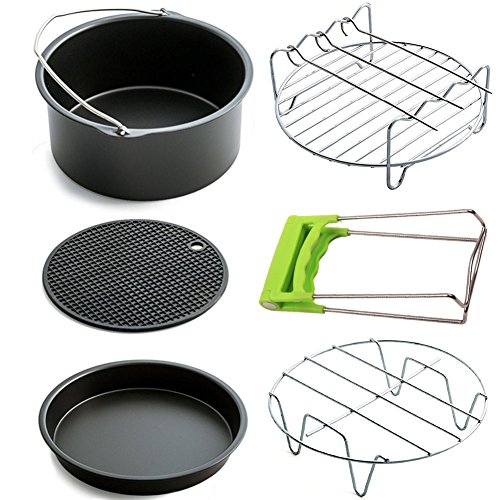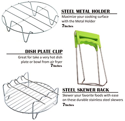 - ★ AIR FRYER ACCESSORIES KIT: The air fryer accessories includes 1 cake barrel, 1 pizza pan, 1 metal holder, 1 double layer rack with skewers, 1 heat-resistant silicone mat, 1 Bowl Clip