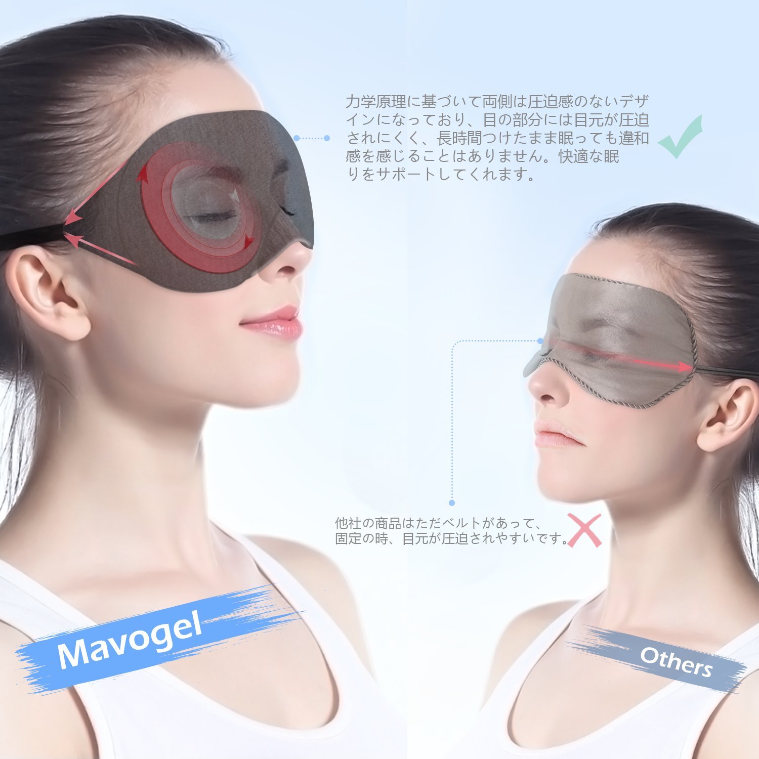 安眠アイマスクの両側は圧迫感のない滑り止めデザインですので、目元は圧迫せずに顔にしっかりフィットします。軽くて長時間つけたまま眠っても違和感を感じることはありませんので、安眠できます。