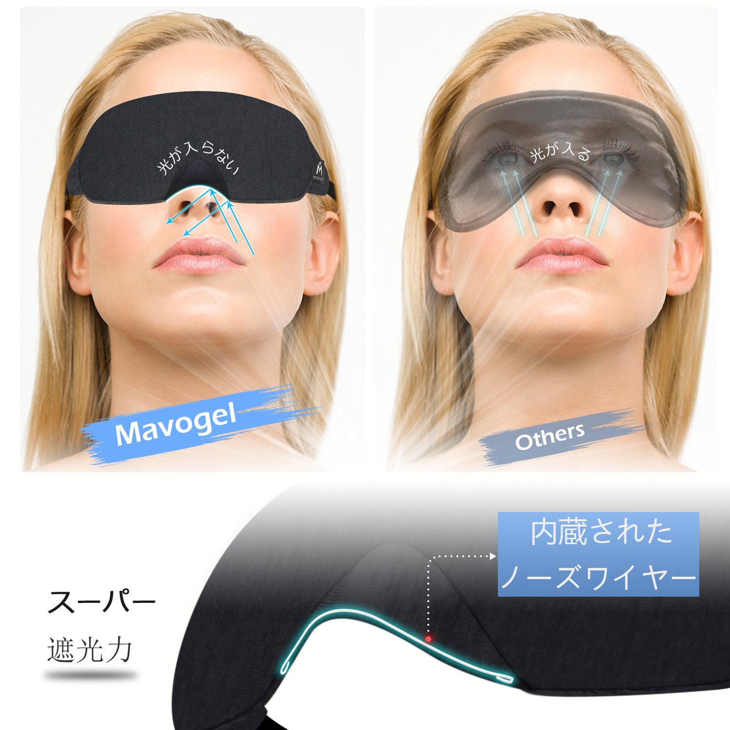スーパー遮光力の安眠アイマスクです。人間の鼻の構造を細かく分析して商品の鼻の部分にノーズワイヤーが内蔵されて、着用の時、自由調節可能です。目と鼻の形にぴったり合うようなデザインになっており、快適な眠りをサポートしてくれます。