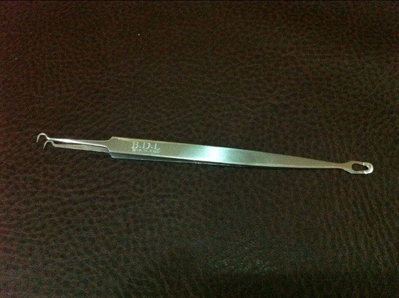 还有它是挑痘的专用工具,但这需要你用得熟了才好。夹子头部是用来挑痘,用夹子头部先松一松痘痘,再助推一下,不要用尾部去挤压;如果能直接挑出痘痘,就不用尾部助推了。 如果大家都去过美容店那也许对这种镊子应该很熟悉,高级的美容师都是使用这种镊子做美容的。