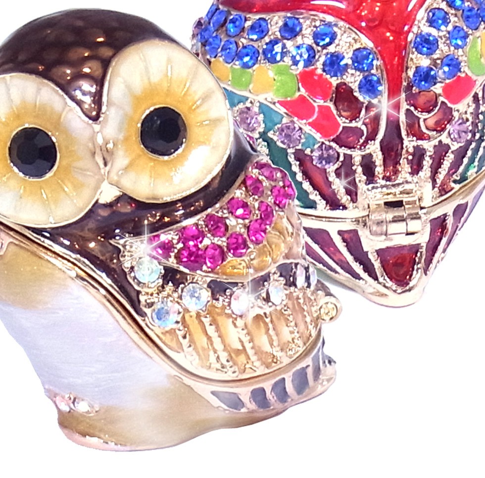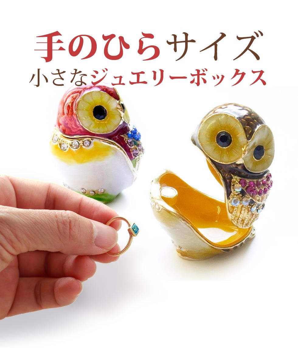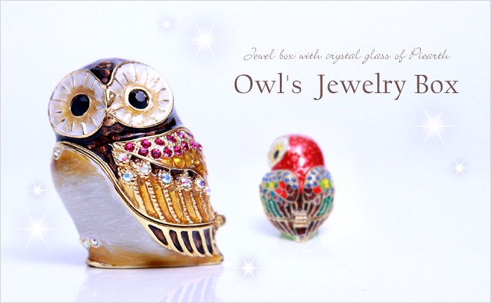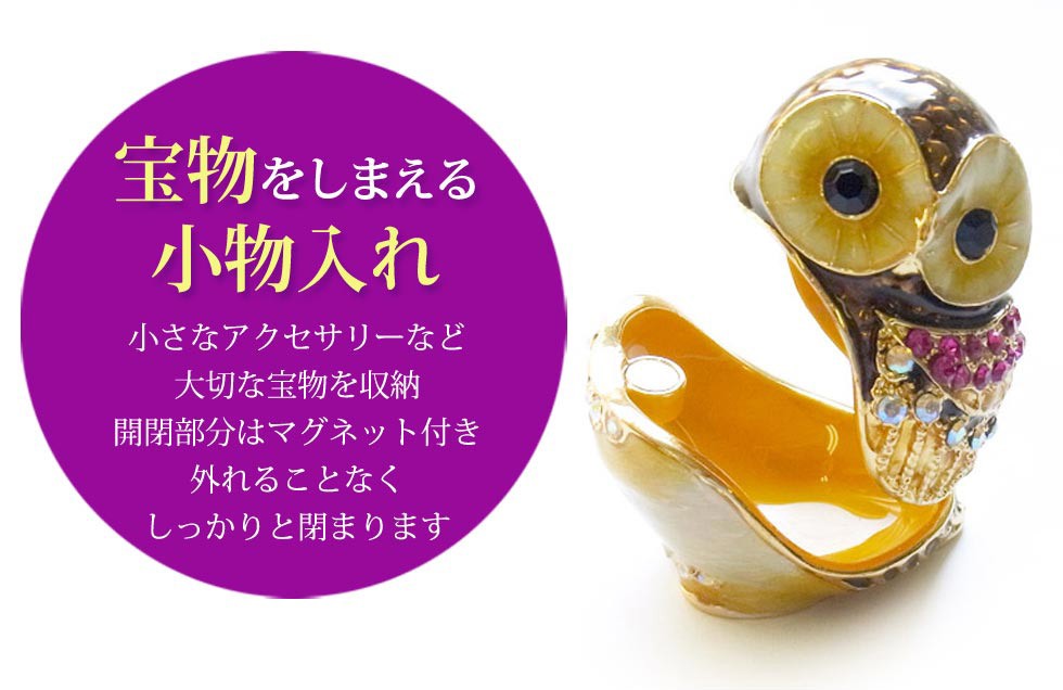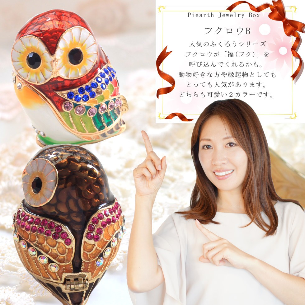 | ジュエリーボックスと言えば、指輪やピアス、ネックレスなどのアクセサリーを入れる引き出し型のケースを思い浮かべる方が多いかもしれません。 ピィアースのジュエリーボックスは、動物や花などをモチーフに作られ、合金製でずっしりとした重さがあります。また高品質のクリスタルガラスを贅沢に使用。まるでジュエリーボックスそのものが宝石のような、高級感溢れる仕上がりです。 小物入れとしても使えるように開閉口には磁石が取り付けてあり、アクセサリーなどなくしやすいアイテムの収納ができます。キラキラと美しく輝く宝石箱は、そのまま飾って楽しめるインテリア雑貨として多くの方に愛されています。 国内トップクラスのジュエリーボックスメーカーであるピィアースは、2004年ごろから本格的に宝石箱の製造を始め、現在のジュエリーボックスはなんと300種類以上。大規模展示会でもご好評いただいており、全国有名百貨店でも販売されています。 自社工場でひとつひとつ丁寧に手作りし、原型作成、研磨、加工、着色、小さなクリスタルガラスの取り付けなども全て手作業で行われるこだわりのハンドメイド品。完成後は厳しい検品の後、丁寧に梱包作業をしお客様にお届けしております。 ピィアース商品は、全国有名百貨店および全国有名宝石店チェーンにてお取り扱いいただいている高品質商品です。 ★自分へのご褒美に…コレクションして並べて飾ると、さらにかわいらしさUP! ★恋人へのプレゼント…中にアクセサリーを入れて、サプライズな贈り物として ★家族への感謝ギフト…お母さんや姉妹へ、日頃のありがとうの気持ちを込めて ★誕生日プレゼント…お友達の喜ぶ顔が見たいから、いつもと違うキラキラギフトを ★小さな女の子へ…まるでお姫様が使っているようなキラキラ宝石箱は女の子の憧れ! |