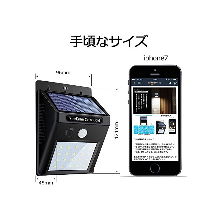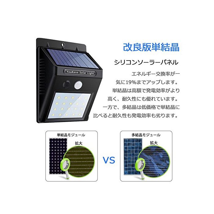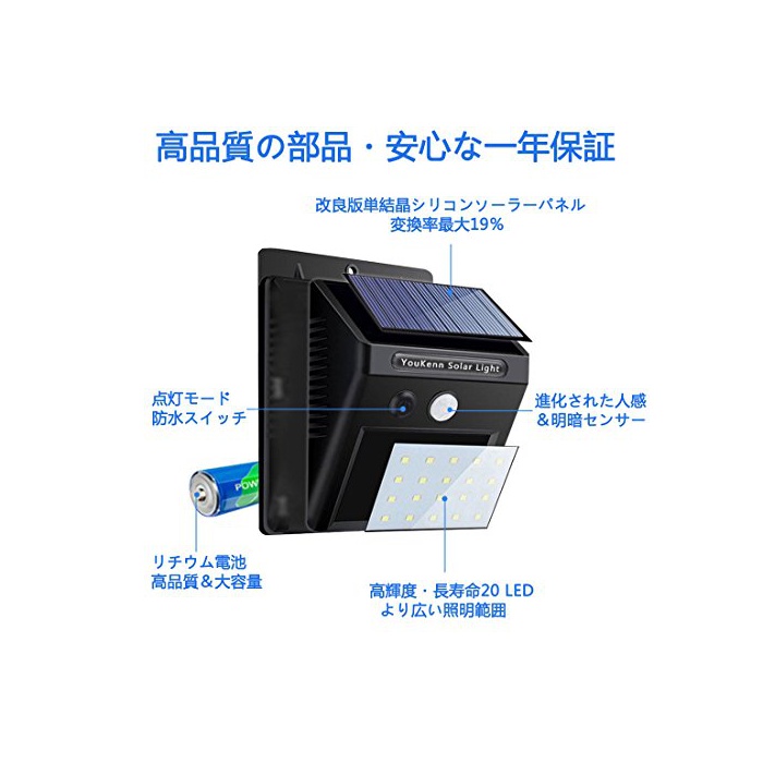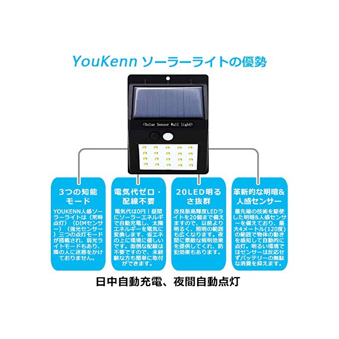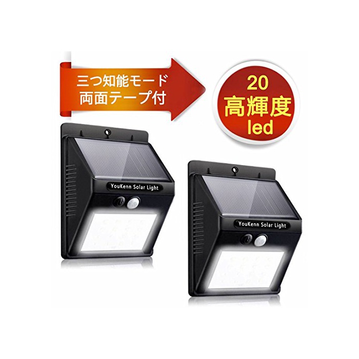 원본상품명: 【改良版】YouKennソラライト 人感センサライト 3つ知能モド 高輝度20LED 面テプ付 防犯ライ ト ボタン付き 太陽電 屋外照明 夜間自動点 2個セット