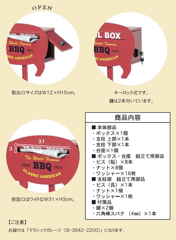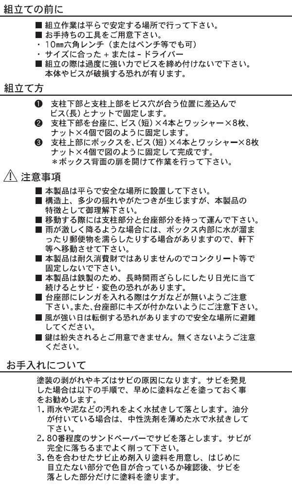 fk094igrjsキーロック式のおしゃれなメールボックスです。 製造国:中国 素材・材質:スチール 商品サイズ:W55×L28×H113.5cm 重量:7420g 仕様:投函口サイズ:W31×H3cm取り出し口サイズ:W12×H15cm組立品キーロック式鍵2本・取扱説明書付※お届け地域により、別途運賃がかかる場合やお届けできない場合がございますので、お問い合わせ下さい。
