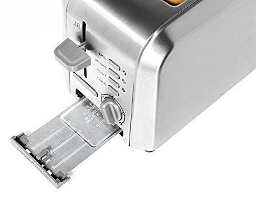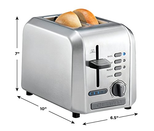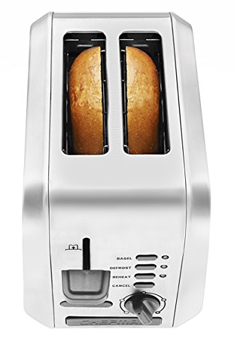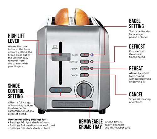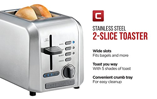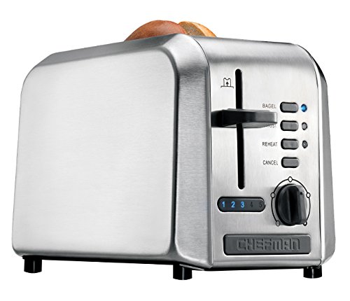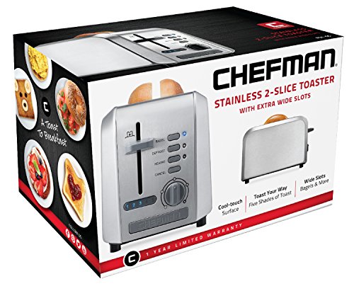 This Chefman 2-slice stainless steel toaster features extra-wide slots that make it easy to toast thin or thick slices of just about anything from homemade bread and bagels to hamburger buns, English muffins, or frozen waffles. The unit's user-friendly control panel offers six functions to choose from. Select Toast, Bagel, Defrost or Reheat (warms previously toasted items). A Cancel button allows for ending the toasting at any time. There's also a dial for a full range of browning options to allow a perfect customization of any piece of bread. Other design details include a high-lift lever that raises even small items for safe retrieval and a removable dishwasher-safe crumb tray for quick cleanup. Get the most of your purchase with access to Club Chefman for recipes, videos, help from a Chef, cookbooks and more!Feature